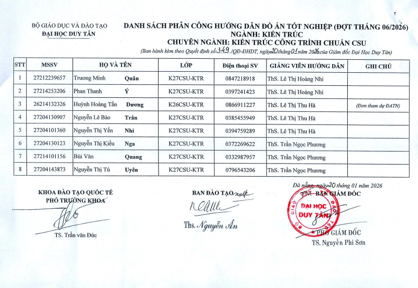 Danh sách phân công hướng dẫn đồ án tốt nghiệp (đợt tháng 06/2026)_chuyên ngành: Kiến Trúc Công Trình Chuẩn CSU