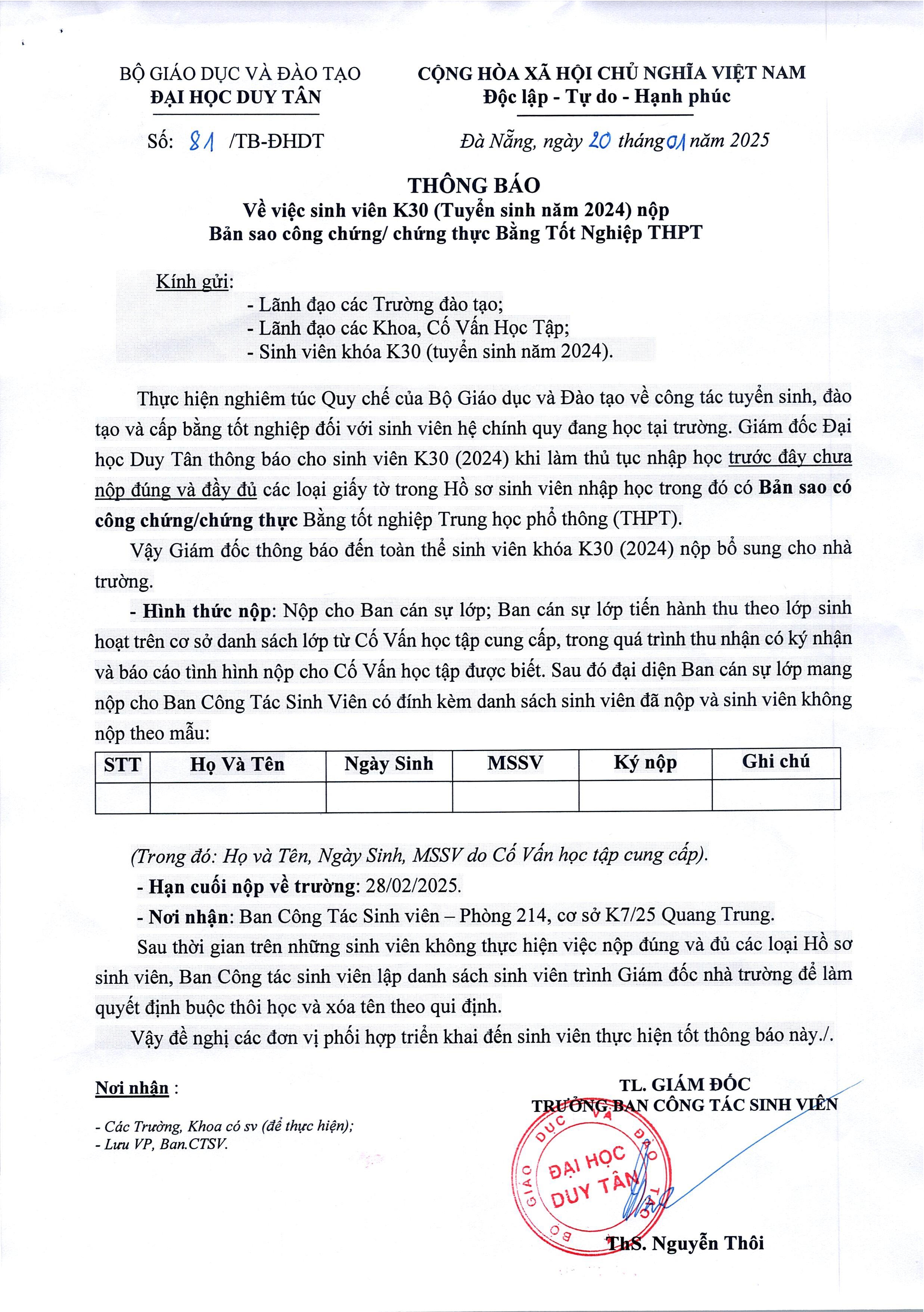 Thông báo V/v Sinh viên K30 nộp Bản sao công chứng/chứng thực Bằng tốt nghiệp THPT