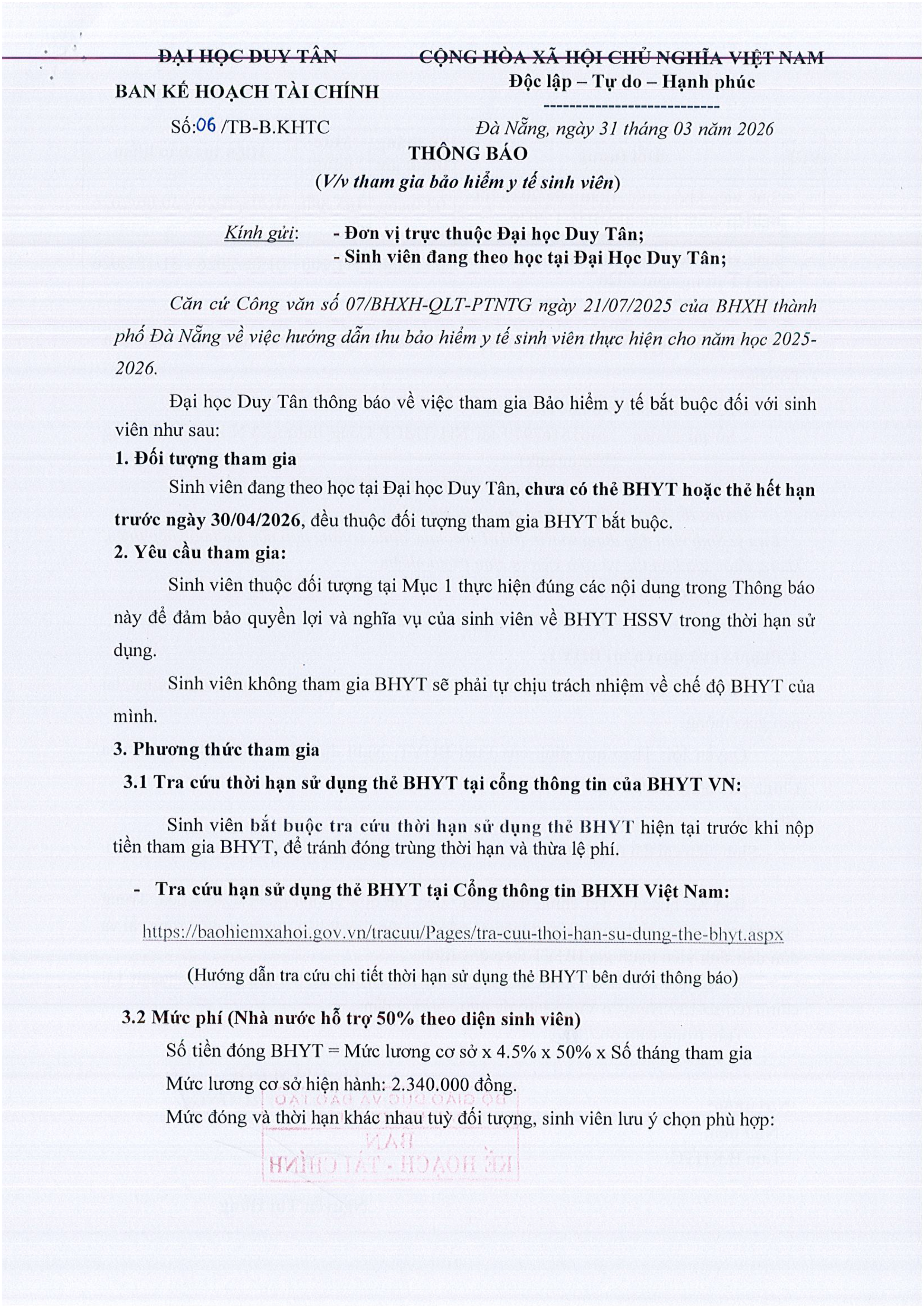 Thông báo v/v tham gia BHYT sinh viên (T3/2026)