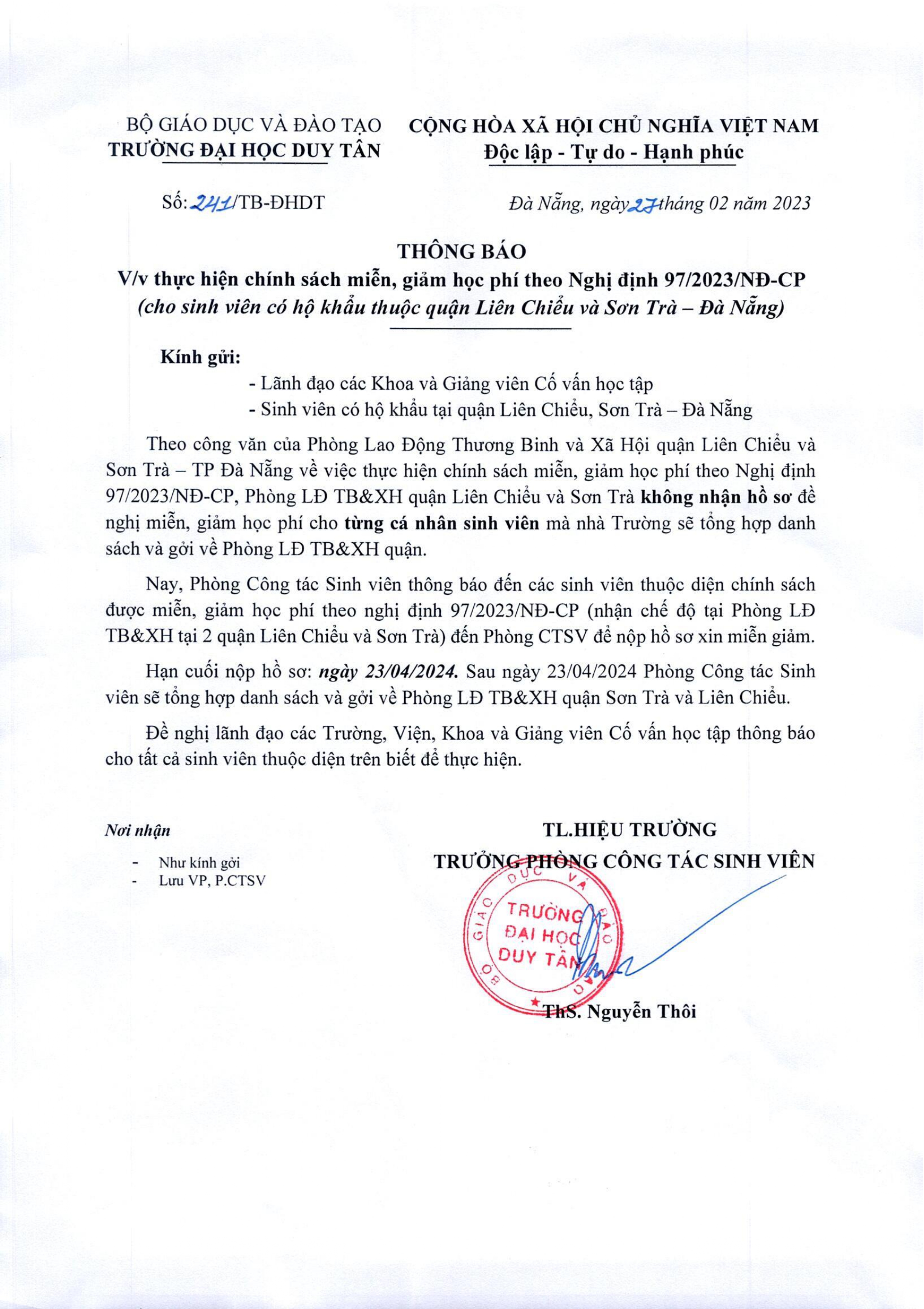 Thông báo v/v thực hiện chính sách miễn, giảm học phí theo Nghị định 97/2023/NĐ-CP