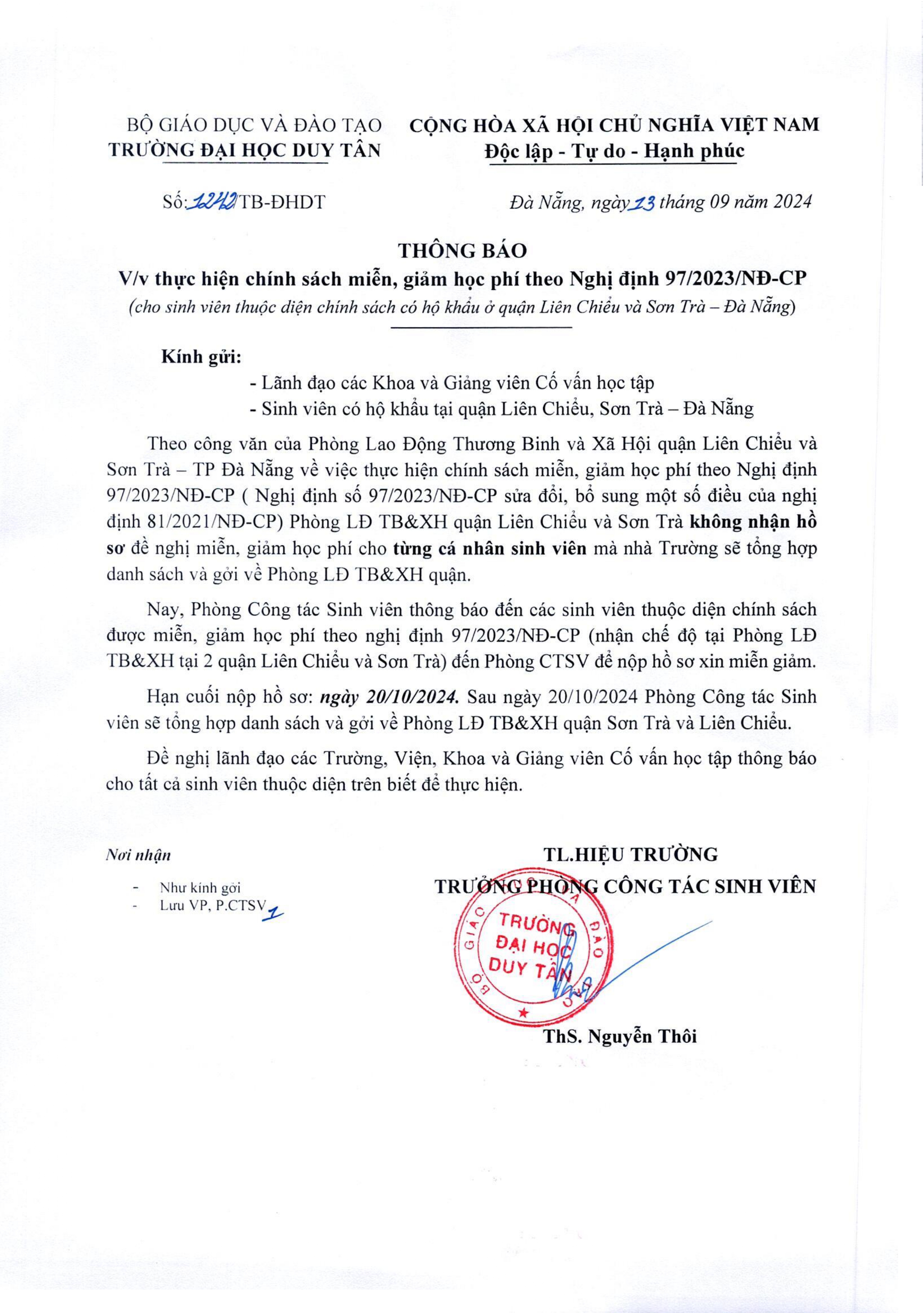 Thông báo v/v Thực hiện chính sách miễn, giảm học phí theo Nghị định 97/2023/NĐ-CP