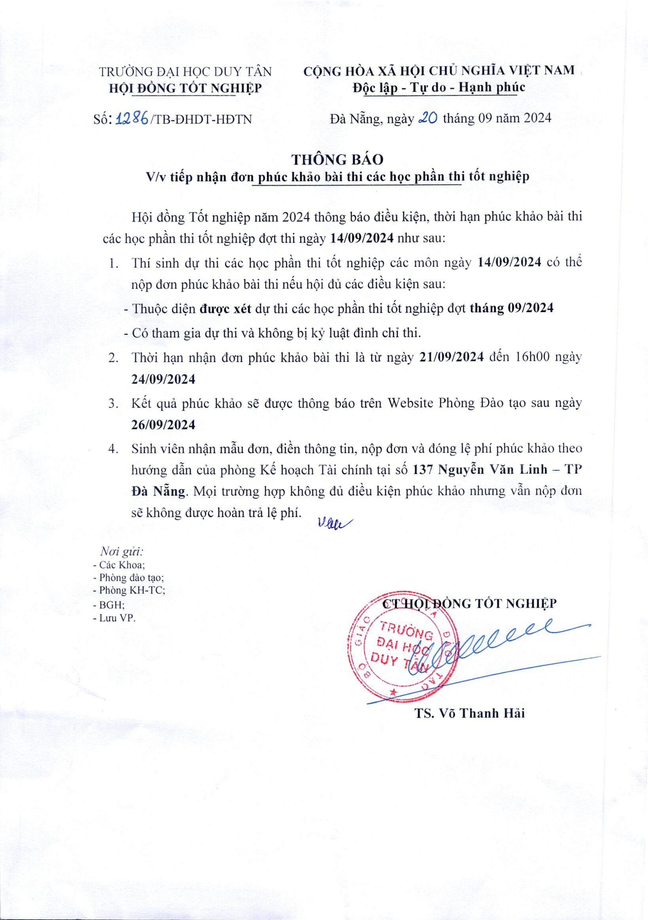 Thông báo V/v Tiếp nhận đơn phúc khảo bài thi các học phần thi tốt nghiệp