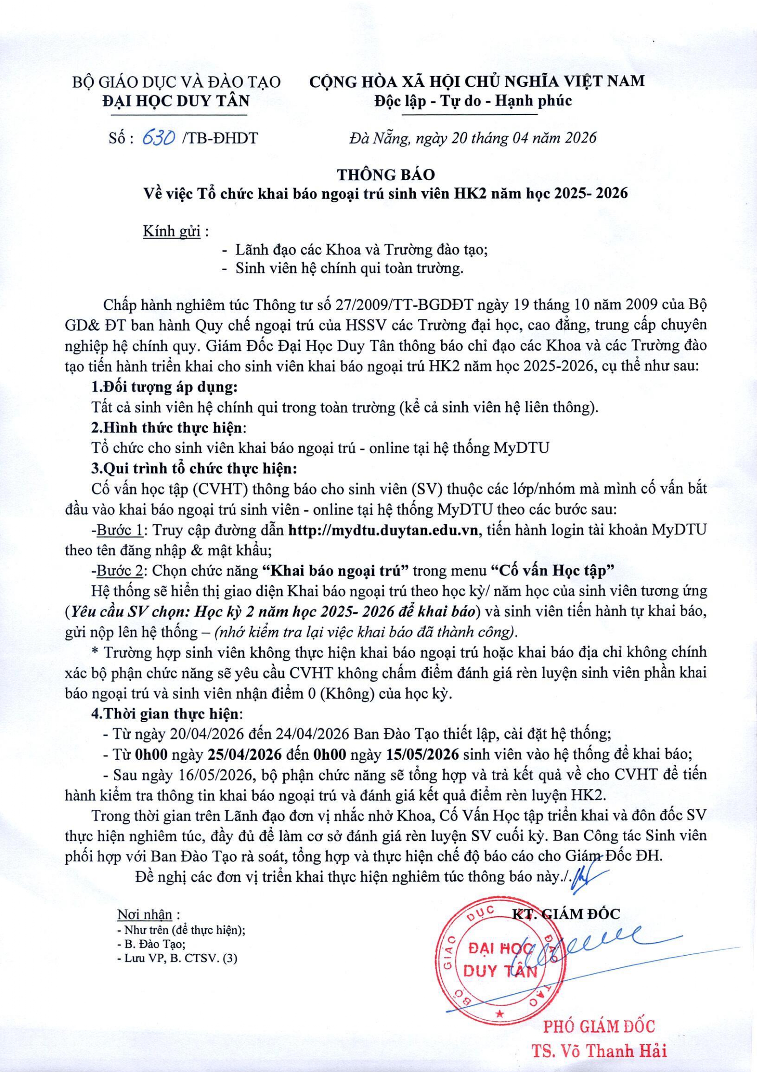 Thông báo V/v Tổ chức khai báo ngoại trú sinh viên HK2 năm học 2025-2026