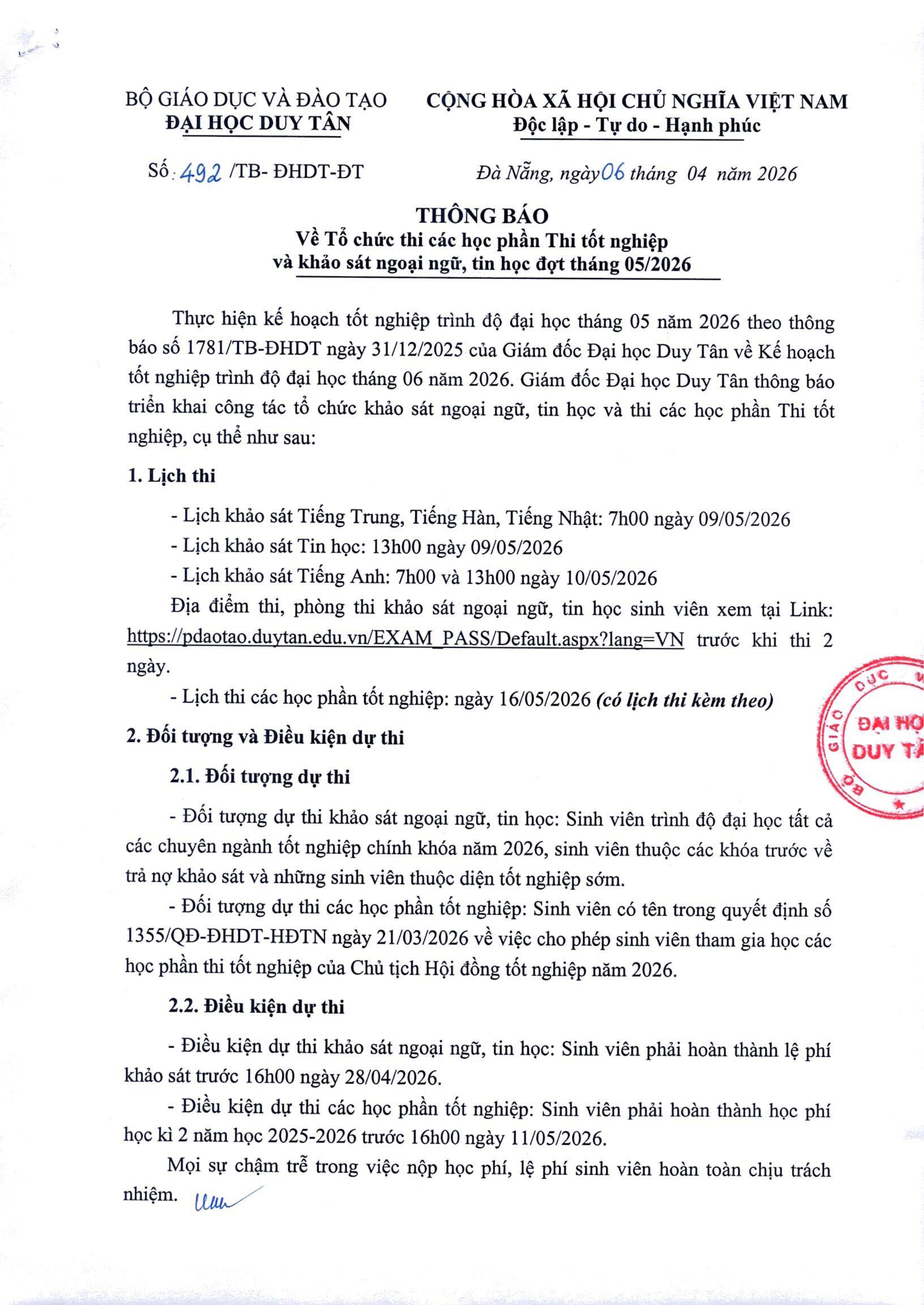 Thông báo V/v Tổ chức thi các học phần Thi tốt nghiệp và khảo sát ngoại ngữ, tin học đợt tháng 5/2026