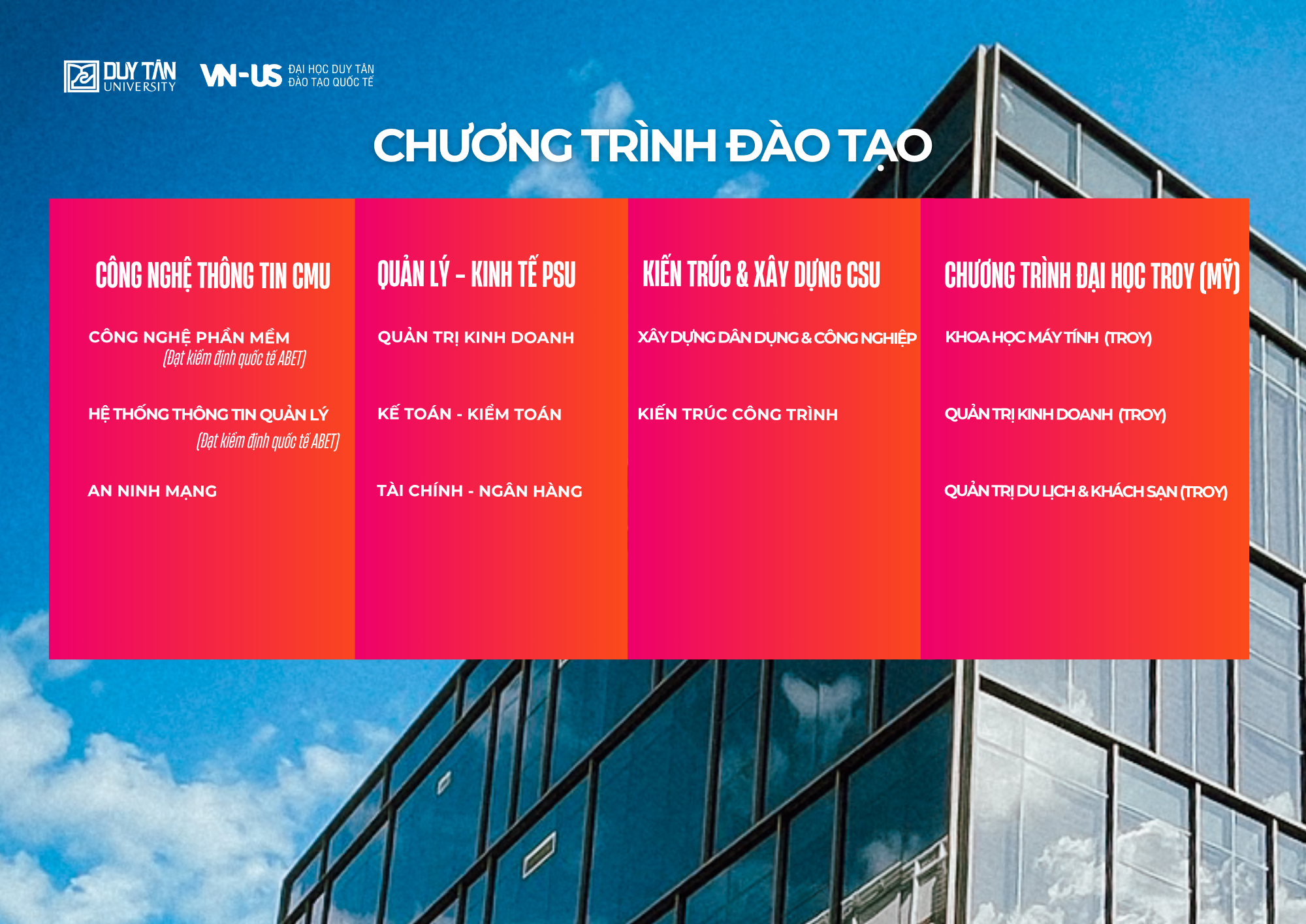 Đại học (ĐH) Duy Tân vừa chính thức thông báo quy hoạch lại toàn bộ chương trình đào tạo để giảng dạy và huấn luyện bắt buộc các kỹ năng Trí...