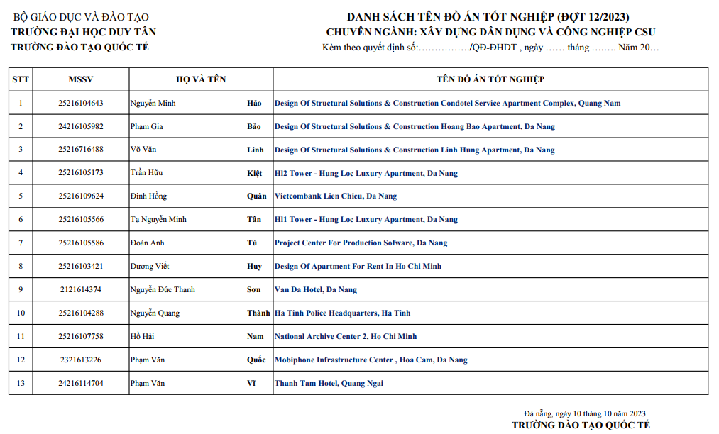 Danh sách tên Đồ án Tốt Nghiệp đợt tháng 12/2023 của sinh viên chuyên ngành: Xây Dựng DD&CN CSU