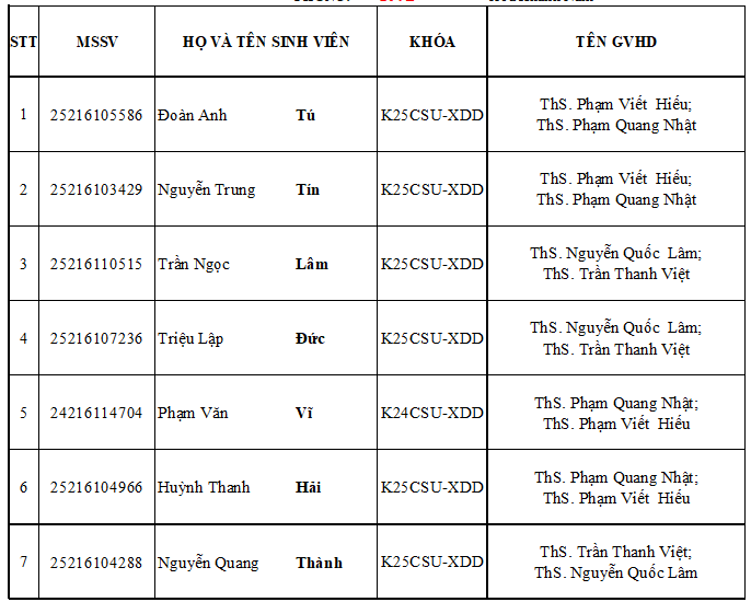Dưới đây là danh sách sinh viên tham gia bảo vệ đồ án Tốt nghiệp.