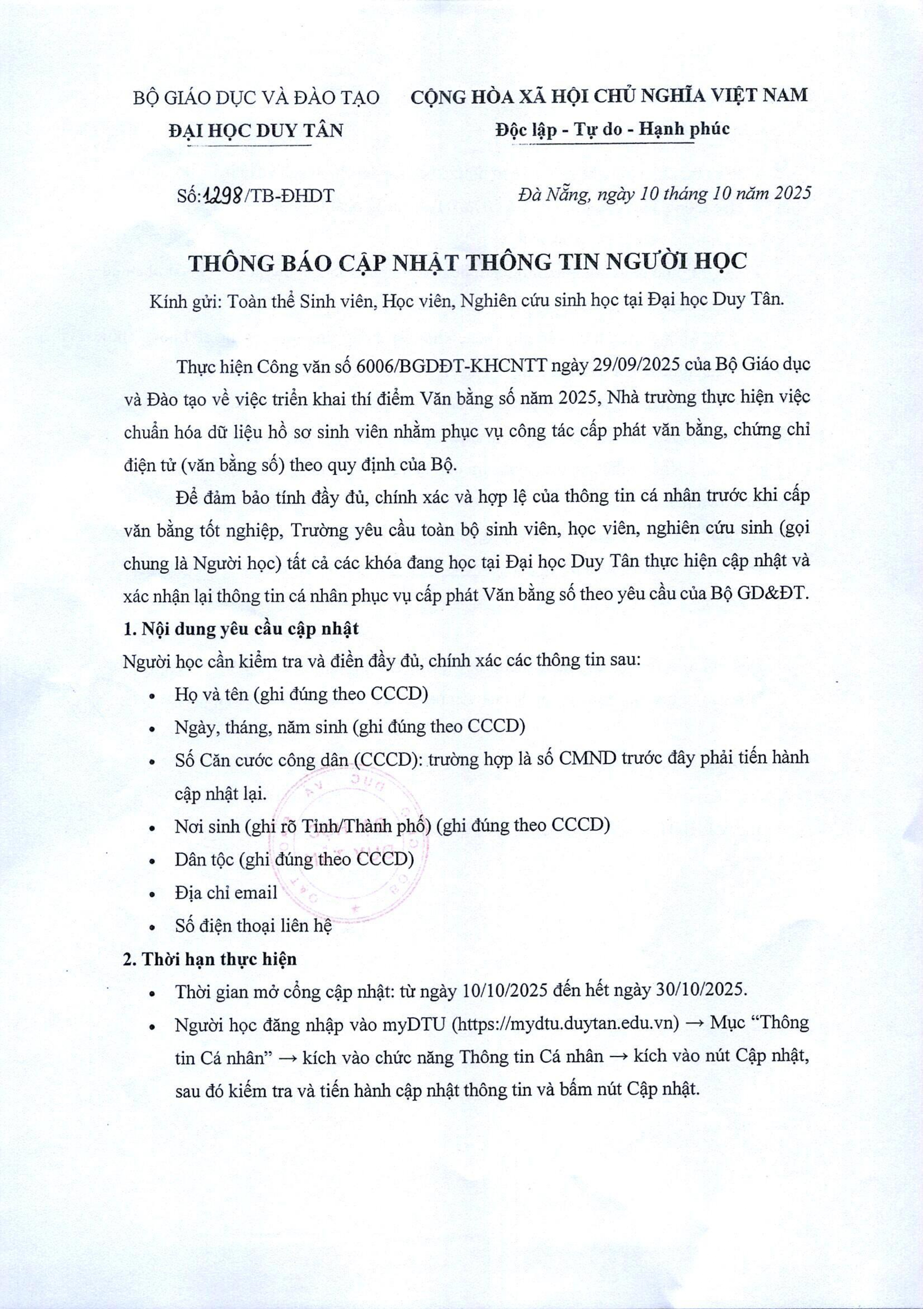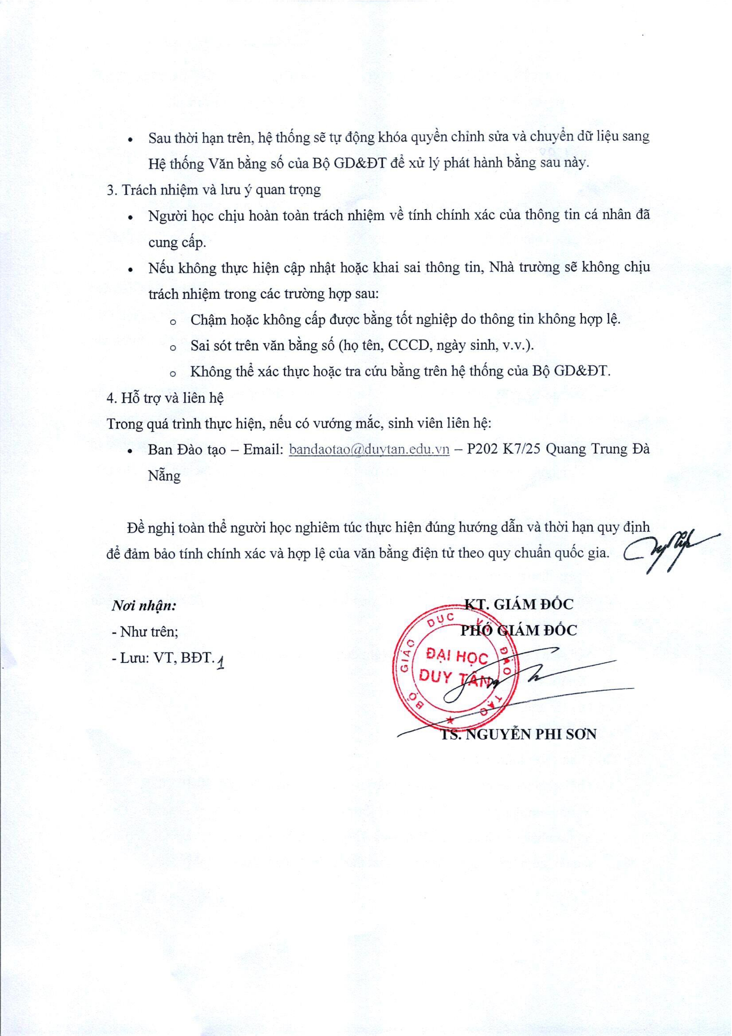 Thông báo cập nhật thông tin người học để triển khai văn bằng số