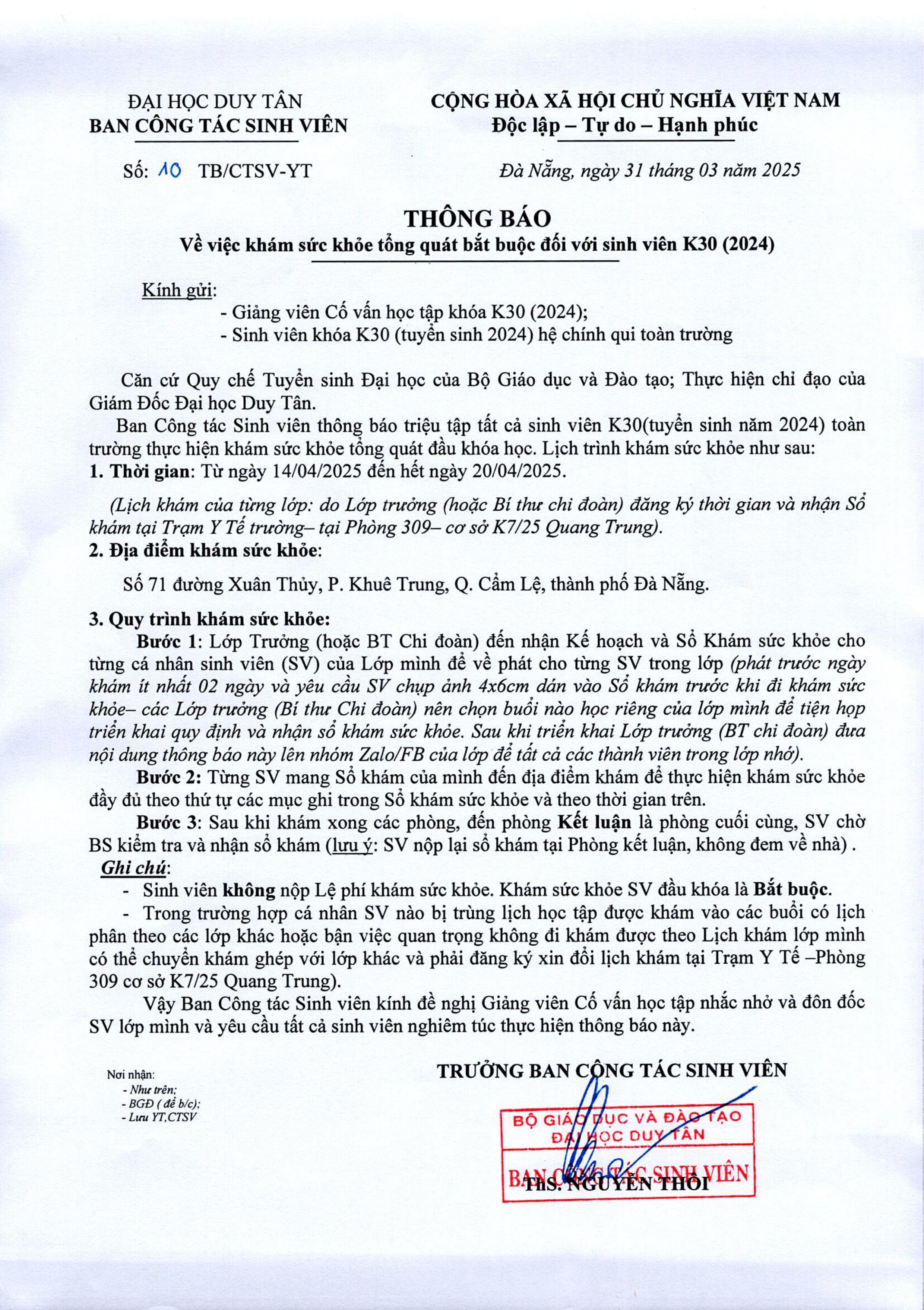 Thông báo V/v khám sức khỏe tổng quát bắt buộc đối với sinh viên K30