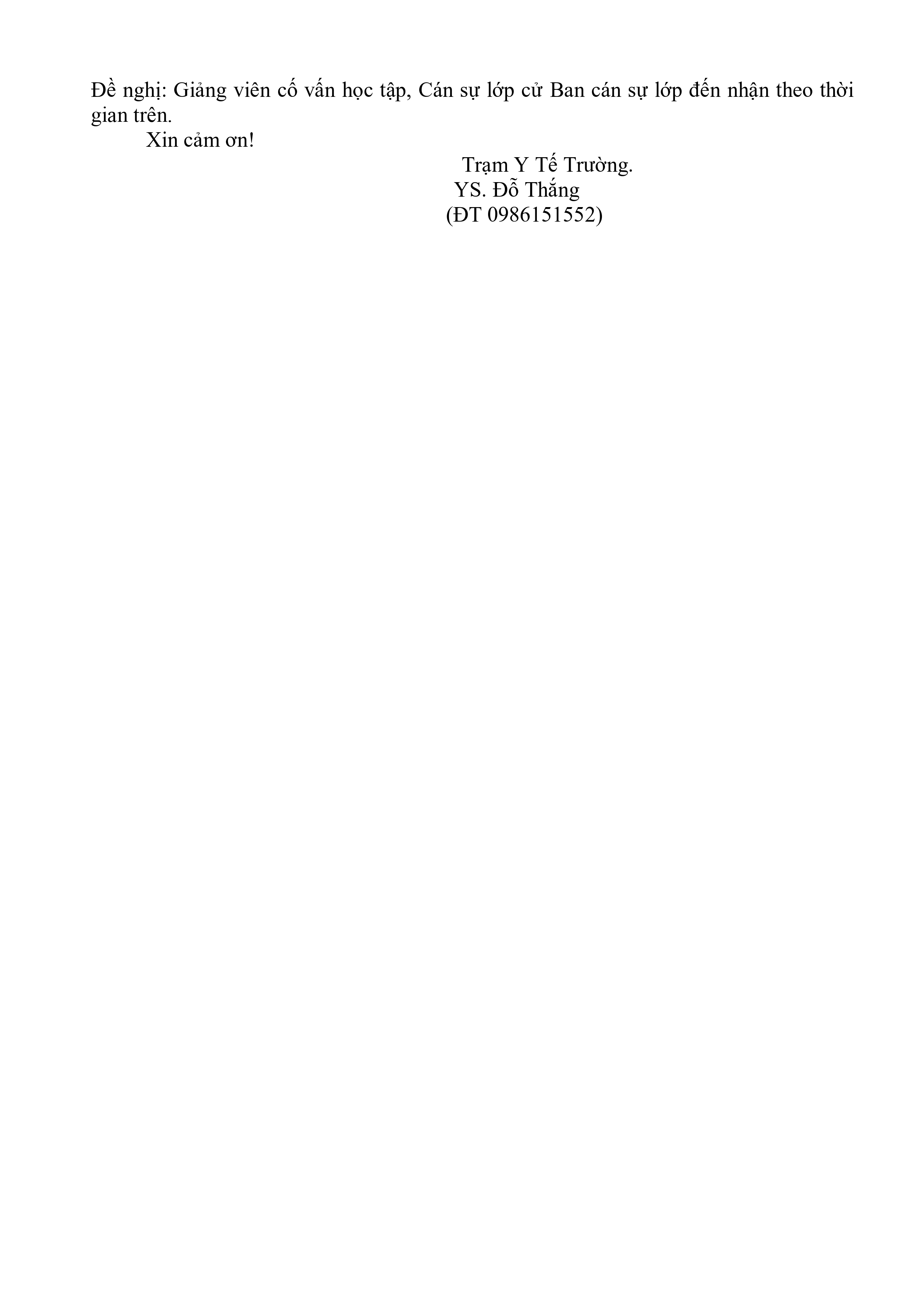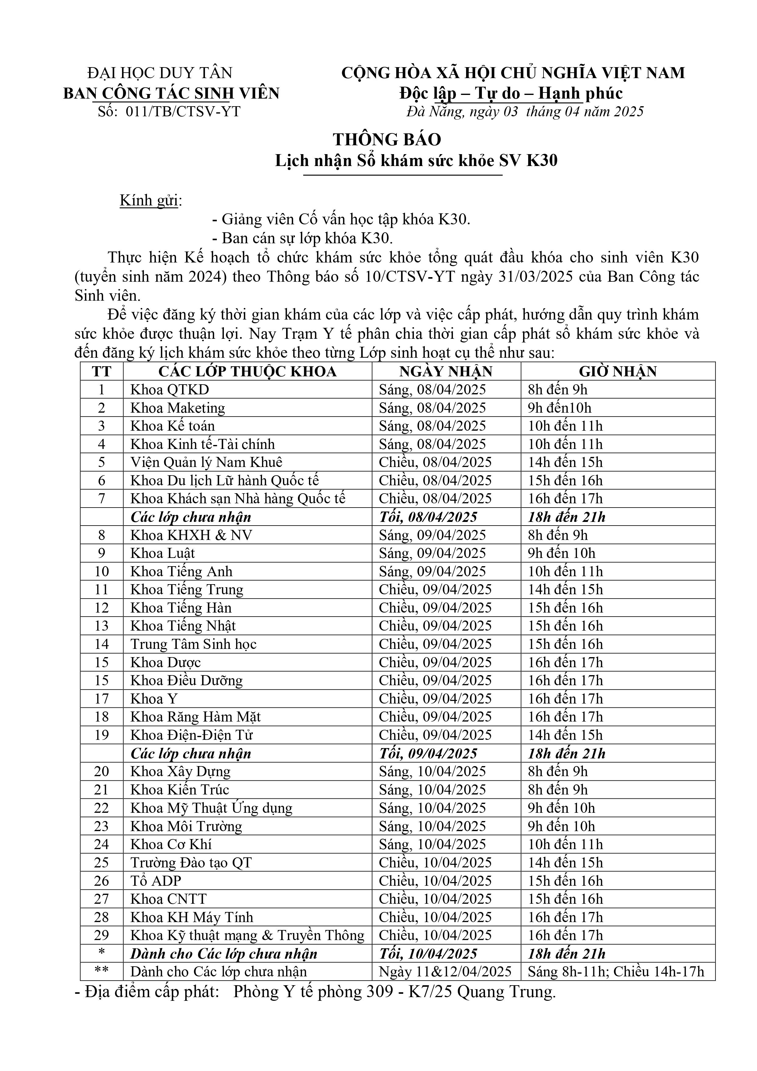 Thông báo Lịch nhận Sổ khám sức khỏe SV K30 dành cho Ban cán sự các lớp K30