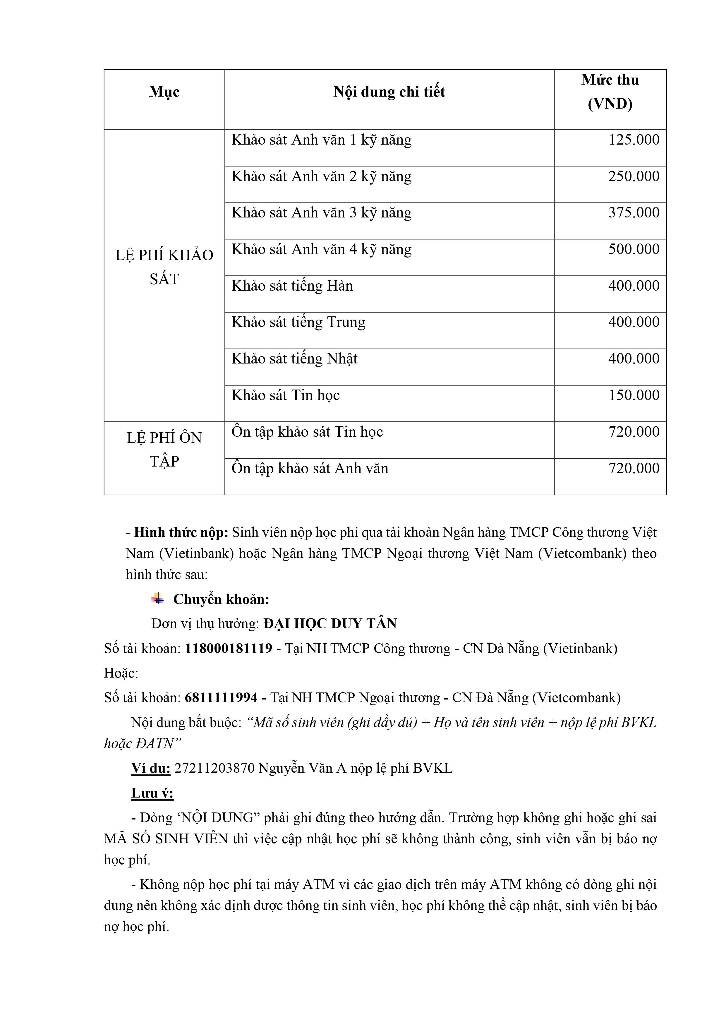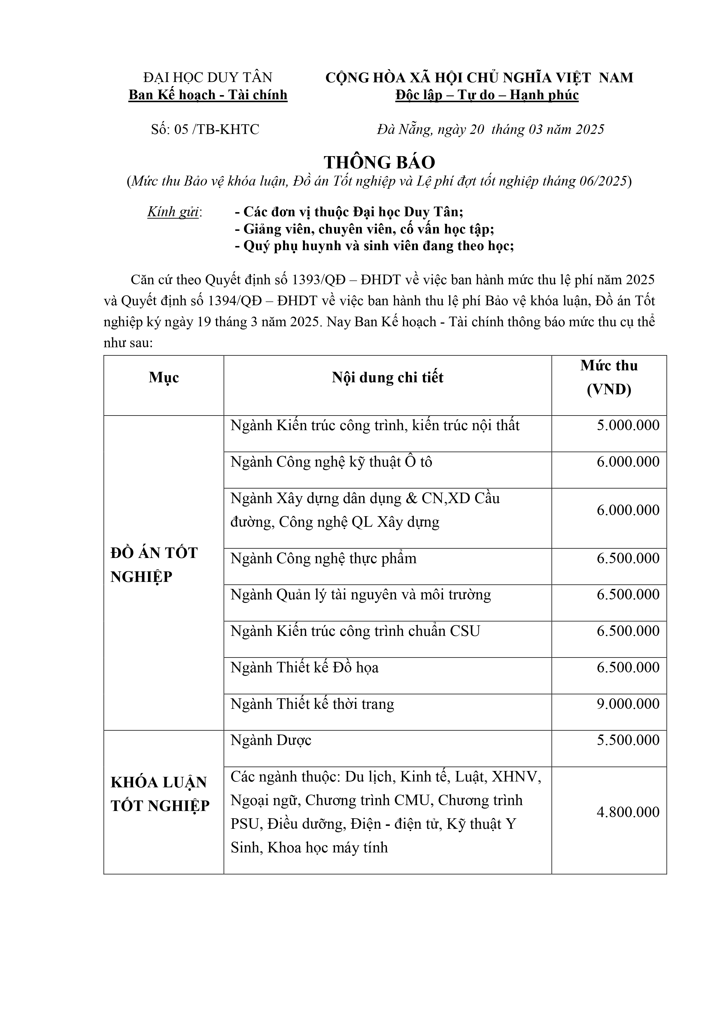 Thông báo Mức thu Bảo vệ Khóa luận, Đồ án Tốt nghiệp và Lệ phí đợt tốt nghiệp tháng 06/2025