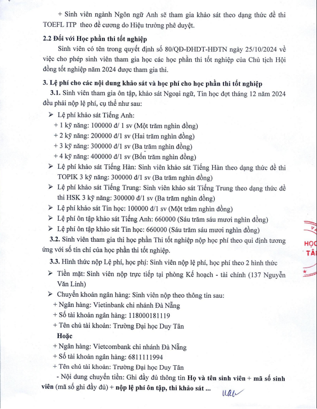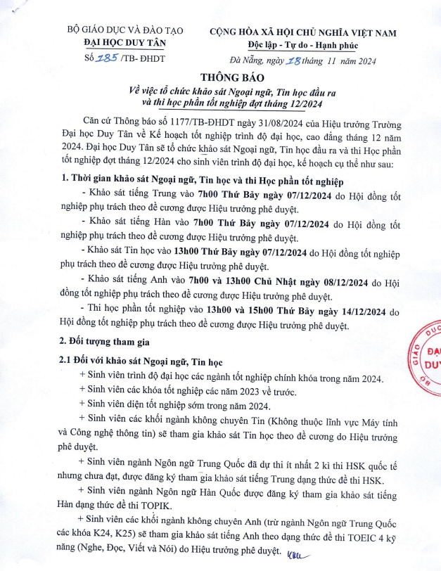 Thông báo về việc khảo sát Ngoại ngữ, Tin học đầu ra và thi học phần Tốt nghiệp đợt tháng 12/2024