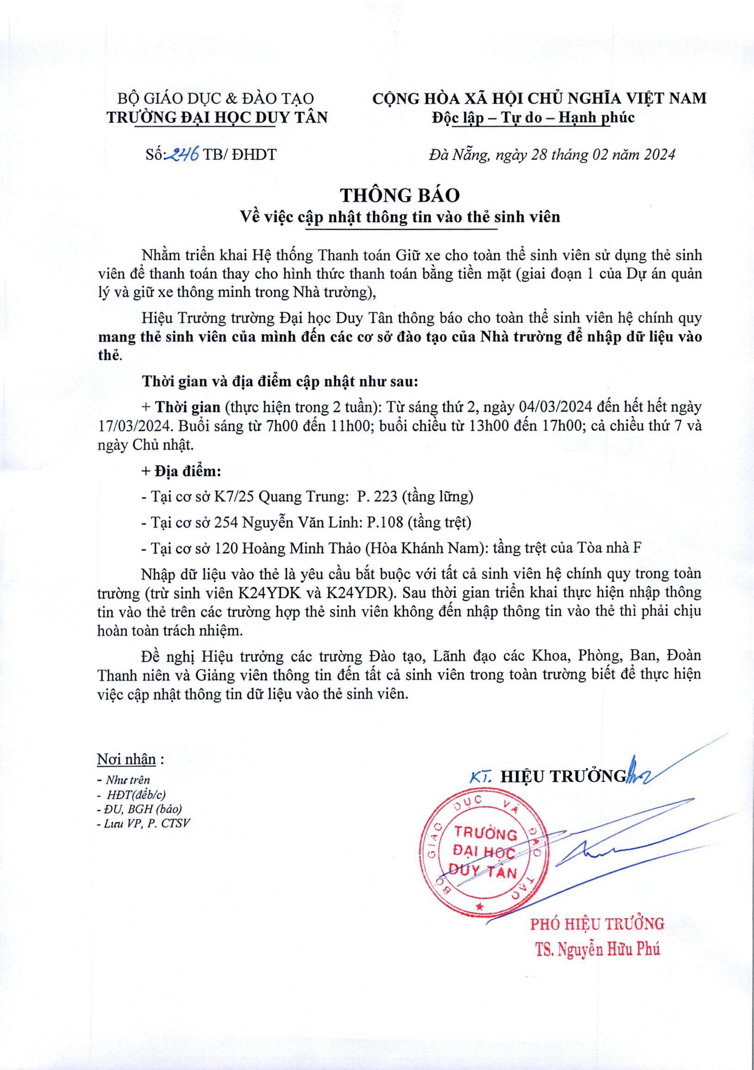 - Thông báo v/v sinh viên không được để phương tiện khu vực tường rào, hành lang đi bộ cơ sở 209 Phan Thanh và 120 Hoàng Minh Thảo
