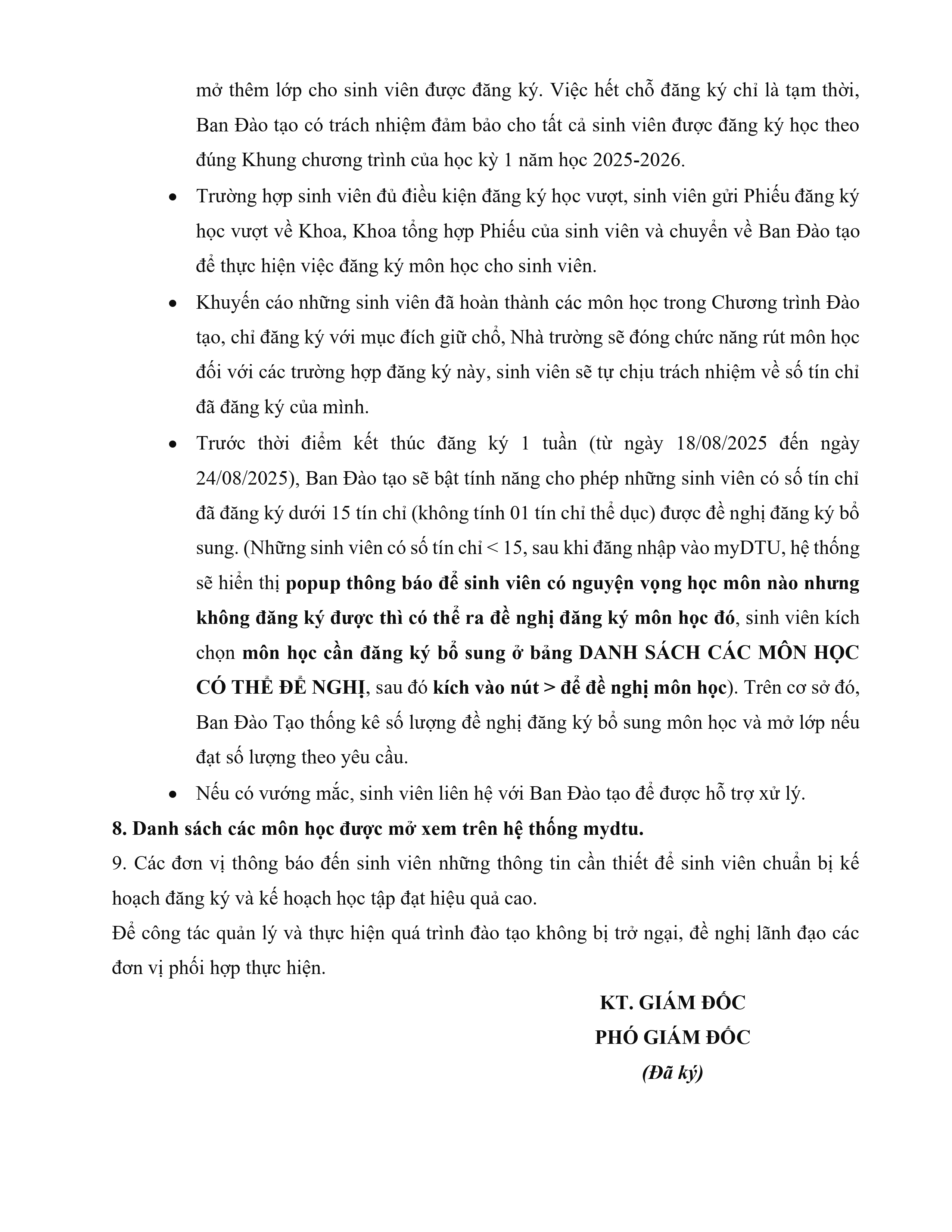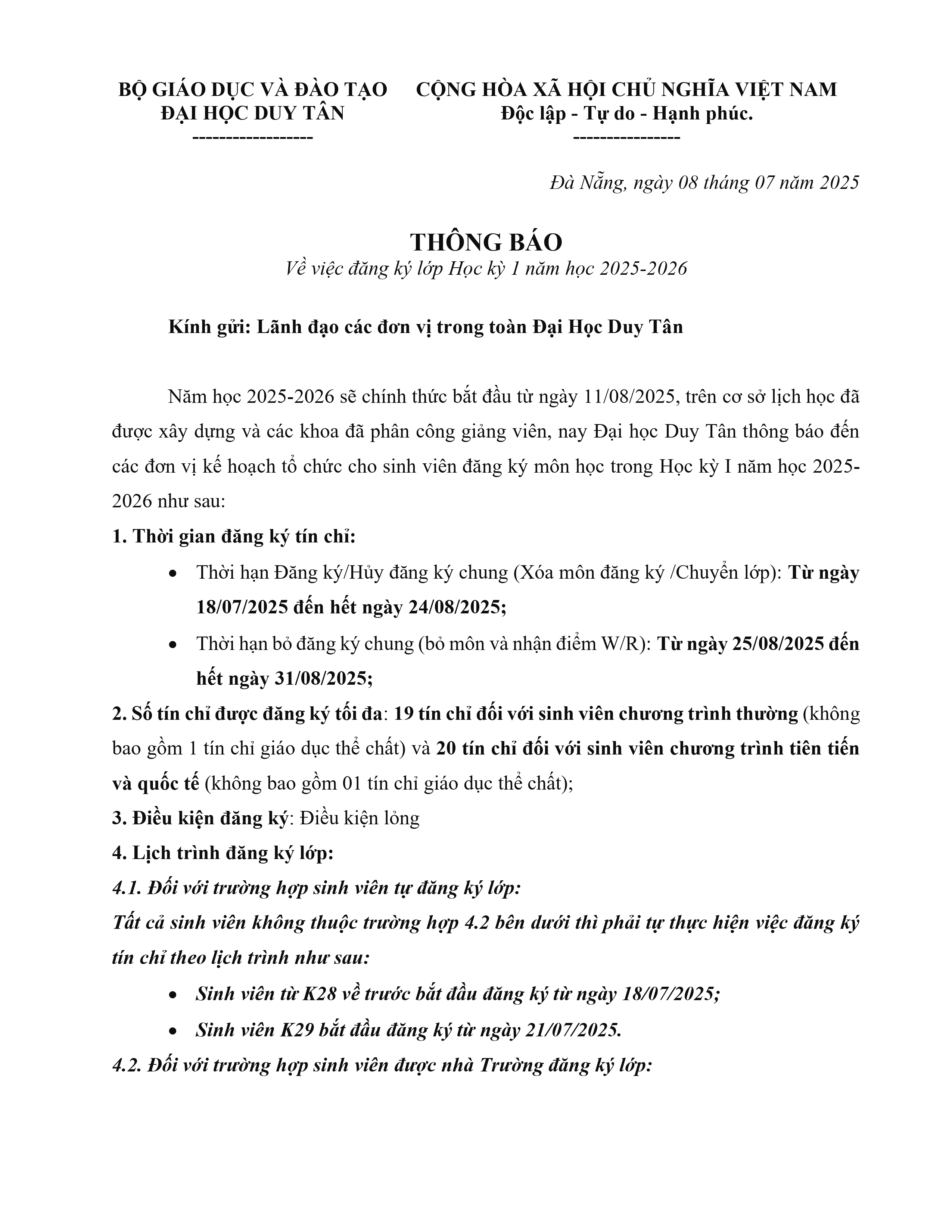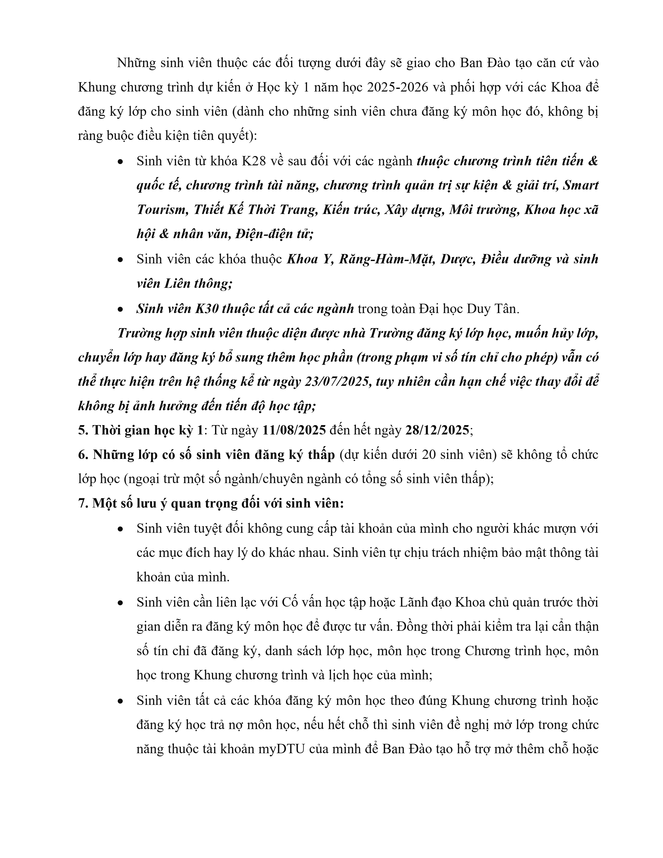 Thông báo V/v Đăng ký lớp HK1 năm học 2025-2026