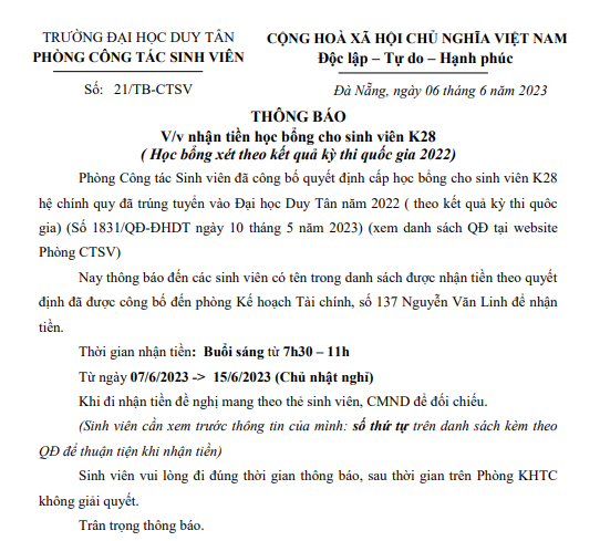 Thông báo v/v nhận tiền học bổng cho sinh viên K28 (Học bổng xét theo kết quả kỳ thi quốc gia 2022)