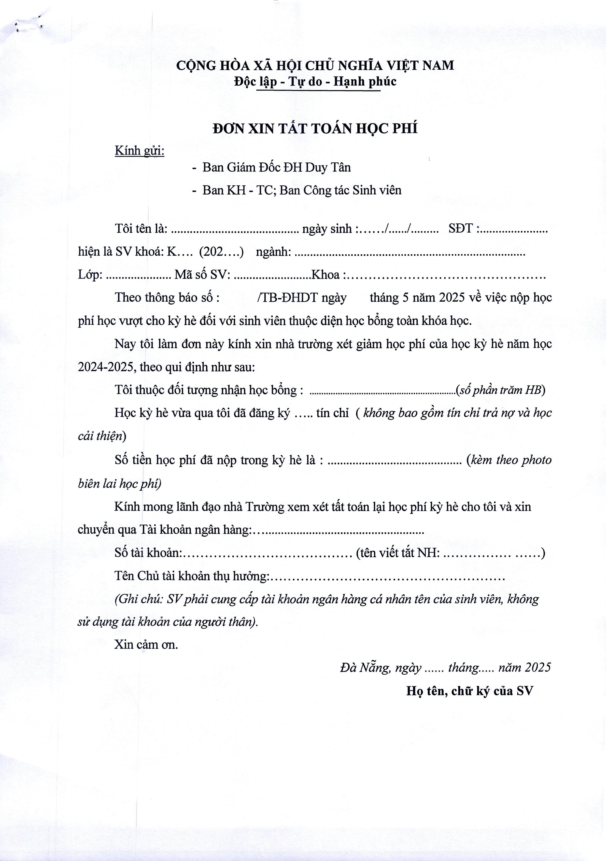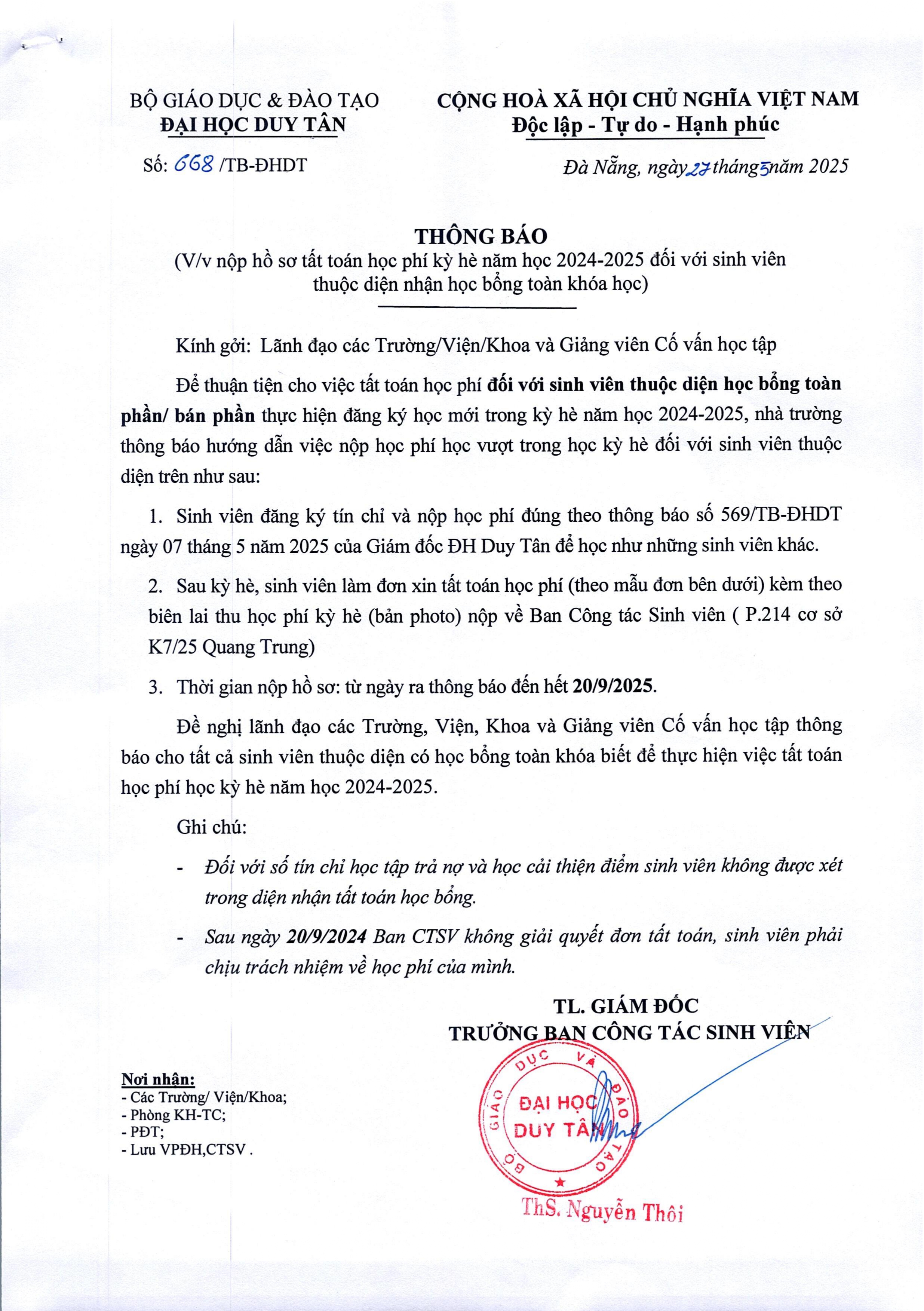 Thông báo V/v Nộp hồ sơ tất toán học phí kỳ hè 2024 - 2025 đối với SV thuộc diện nhận học bổng toàn khóa học