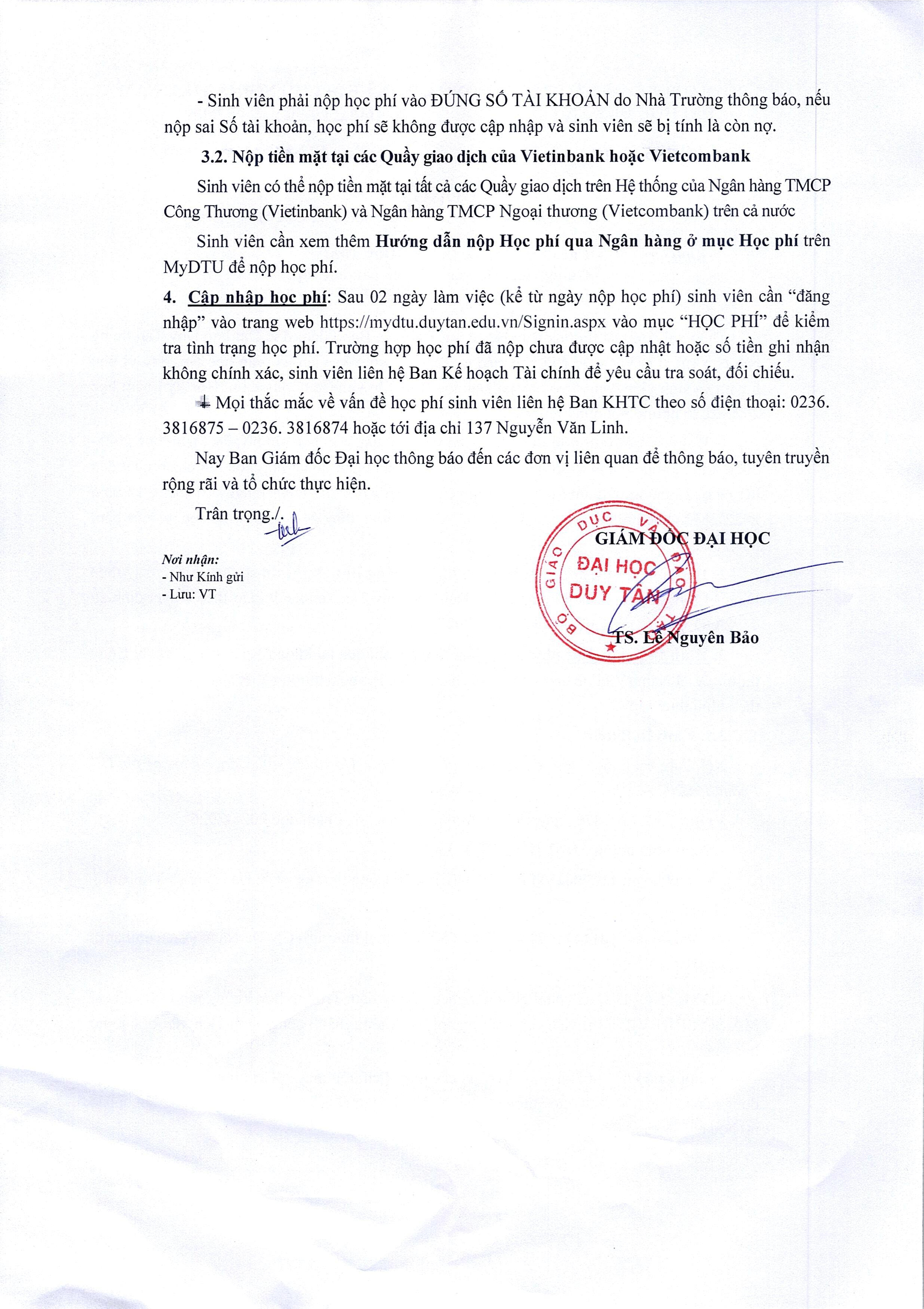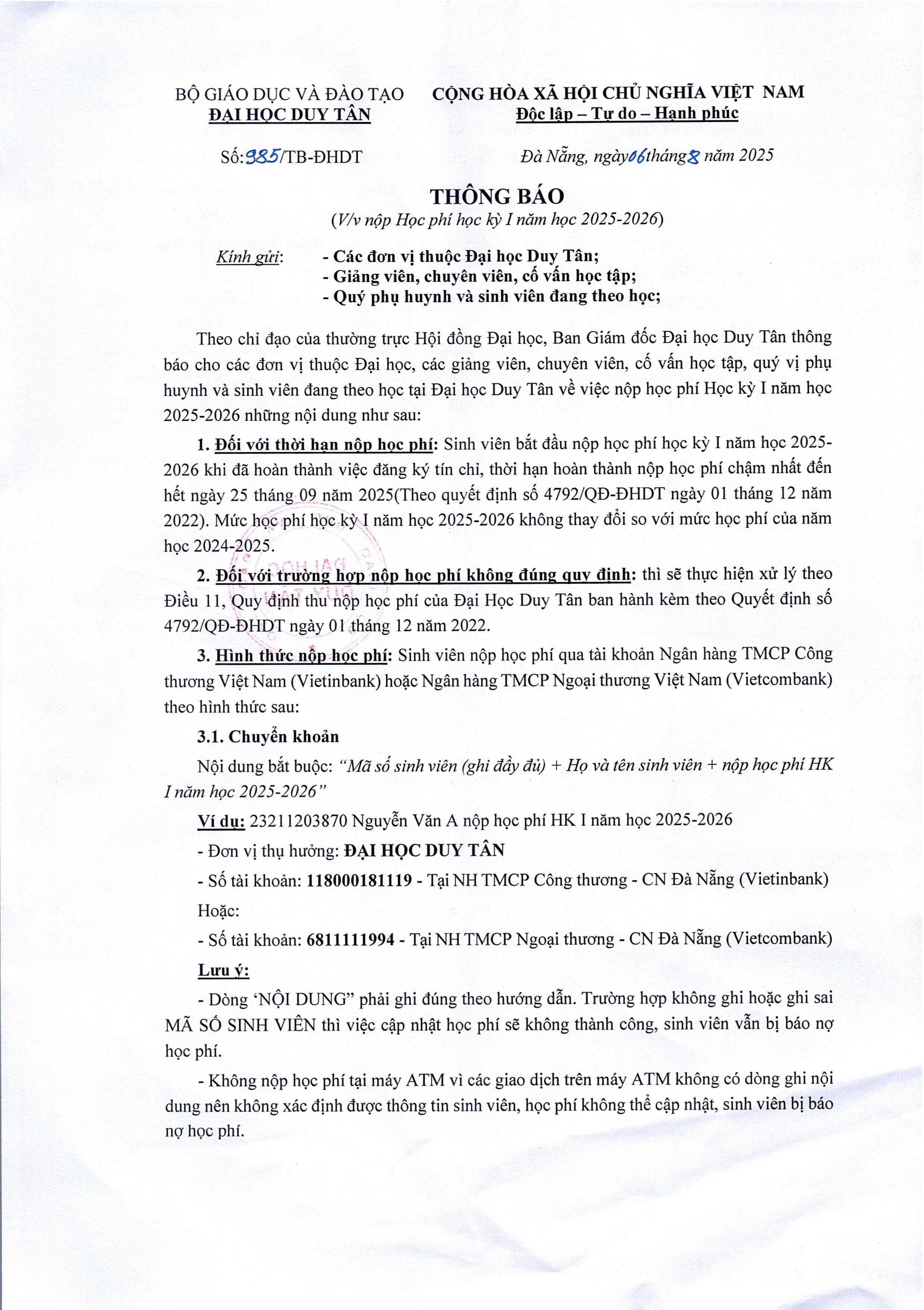 Thông báo V/v nộp Học phí học kỳ I năm học 2025-2026