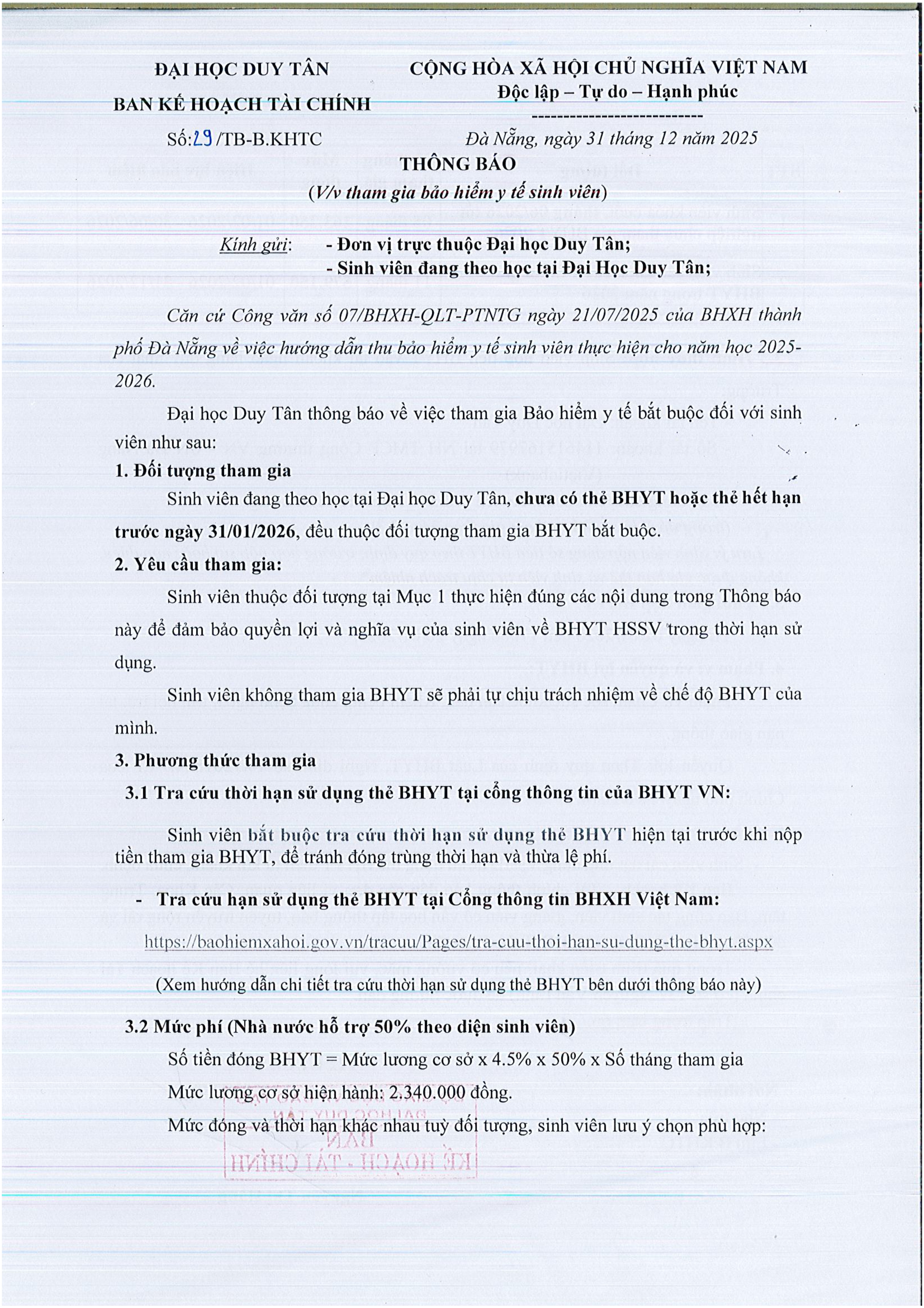 Thông báo V/v tham gia BHYT sinh viên (T1/2026)
