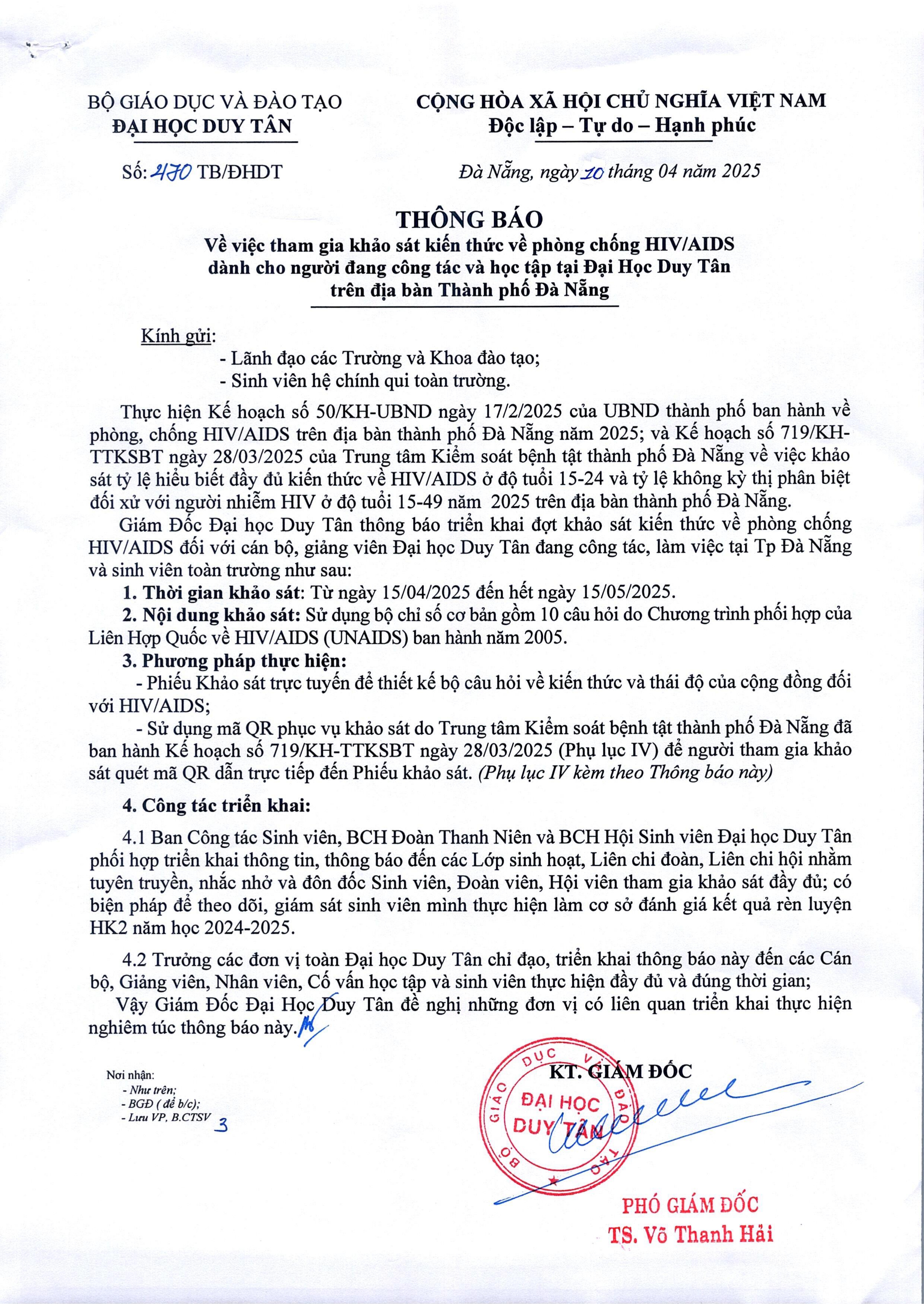 Thông báo V/v Tham gia khảo sát kiến thức về phòng chống HIV/AIDS dành cho người đang công tác và học tập tại ĐH Duy Tân trên địa bàn Tp. Đà Nẵng