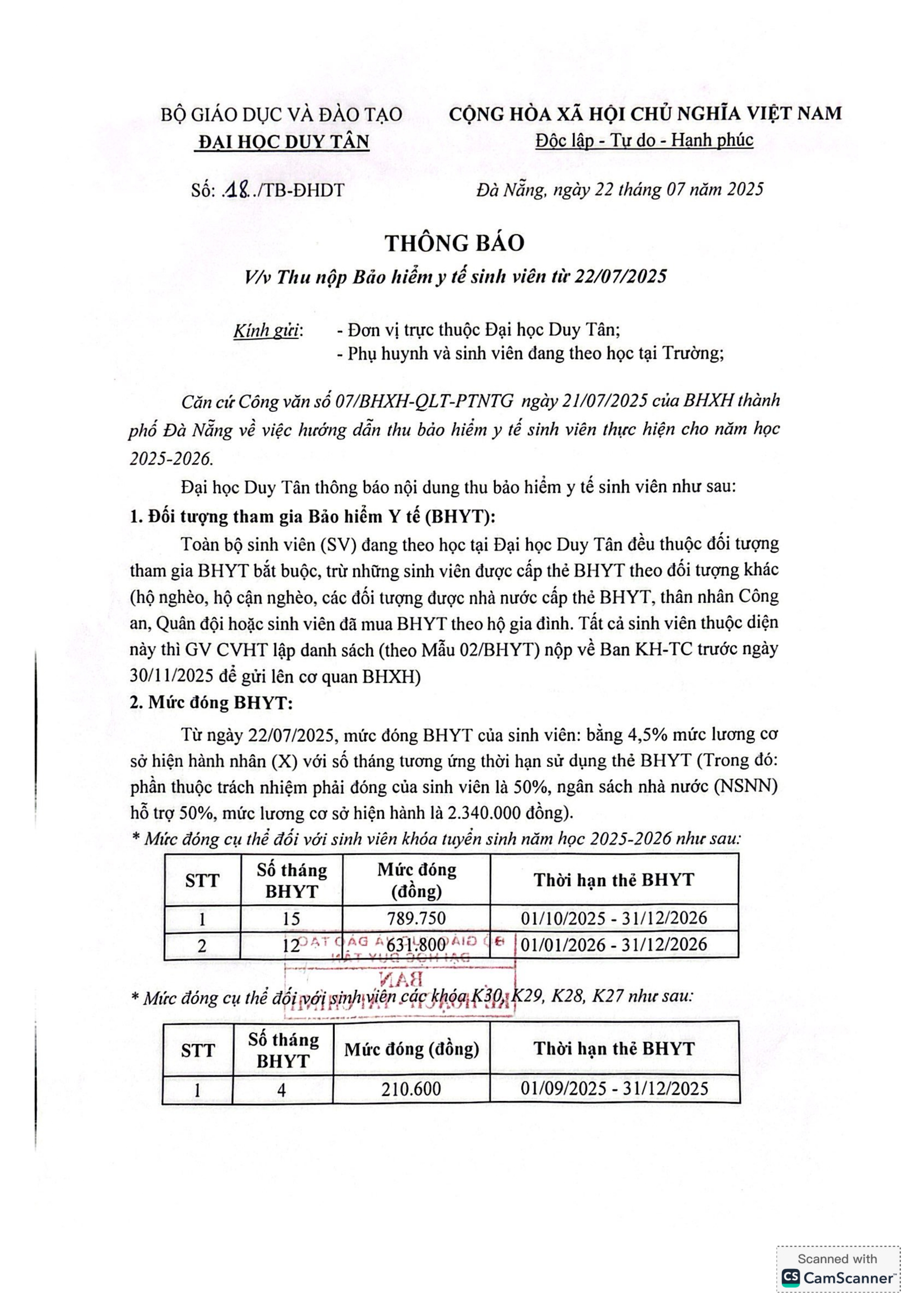 Thông báo V/v Thu nộp BHYT sinh viên từ 22/7/2025