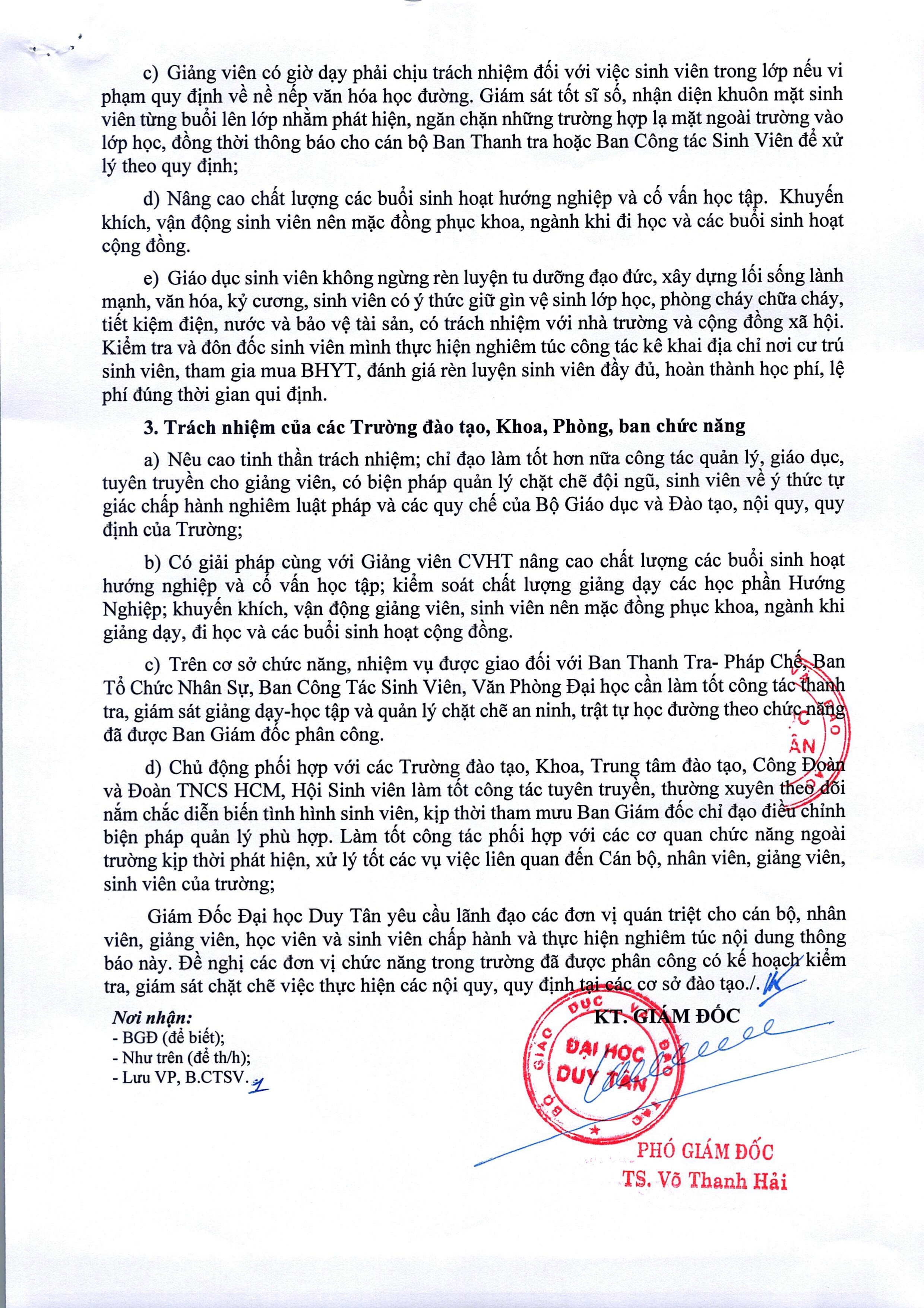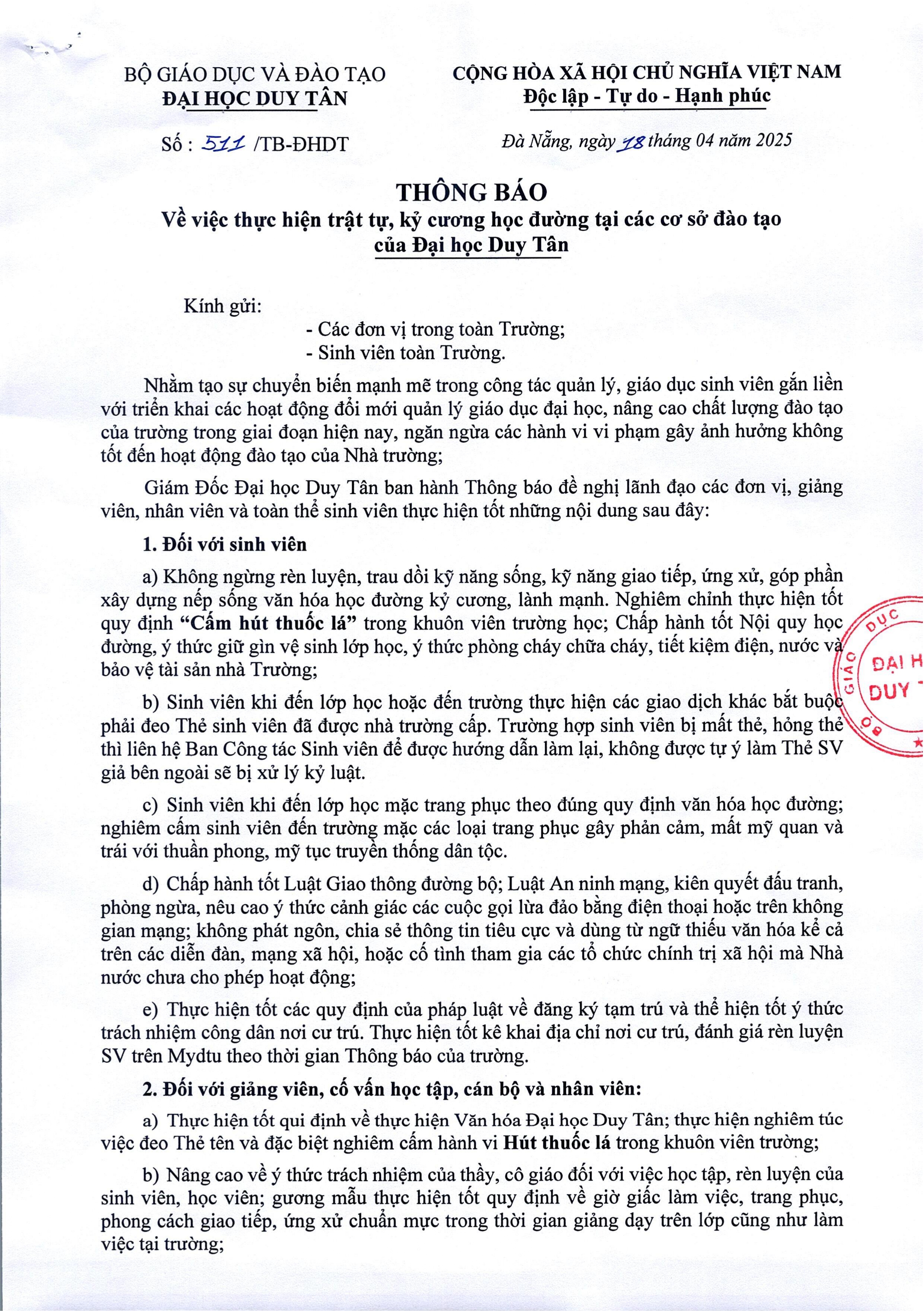 Thông báo V/v thực hiện trật tự, kỷ cương học đường tại các cơ sở đào tạo của Đại học Duy Tân