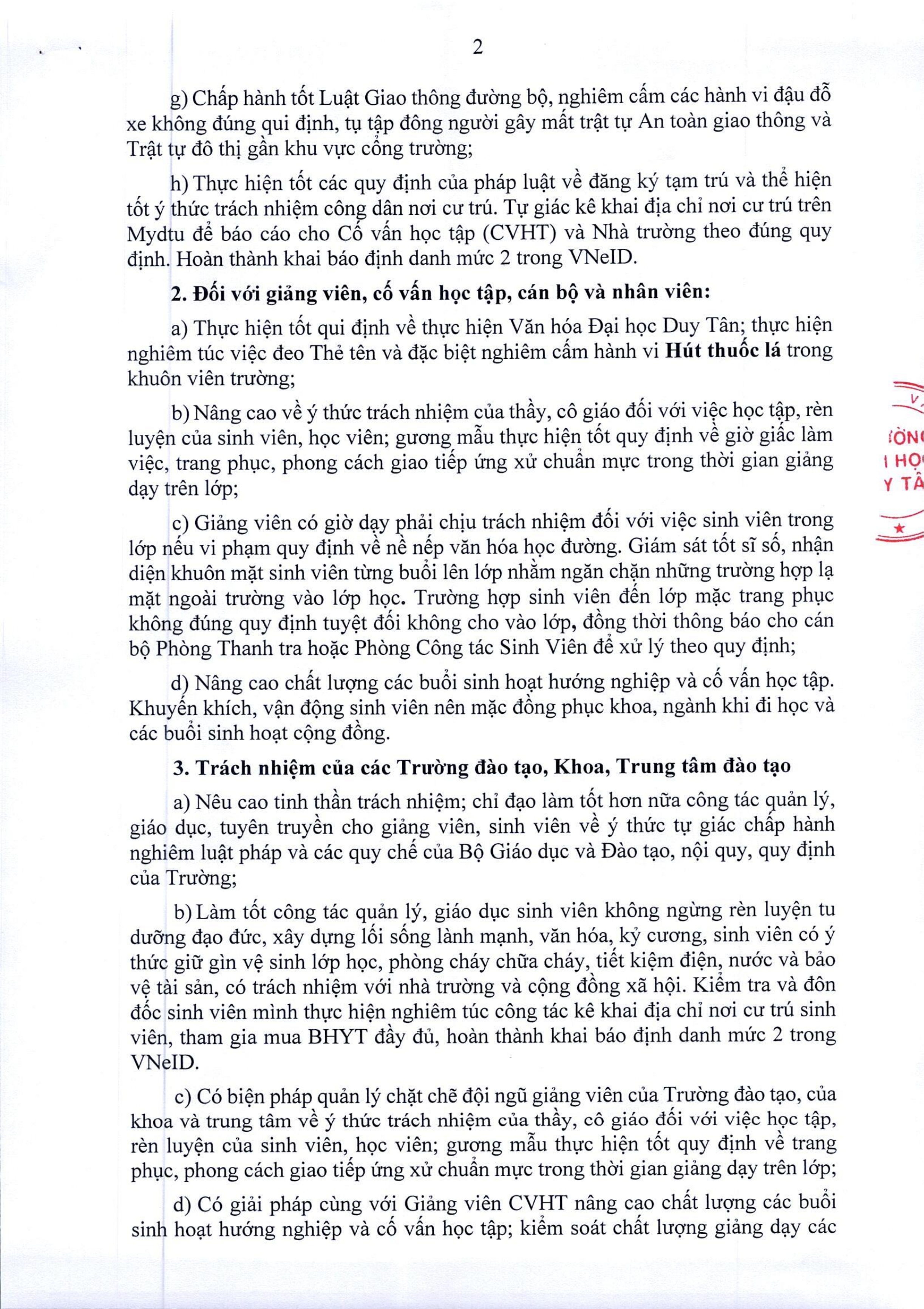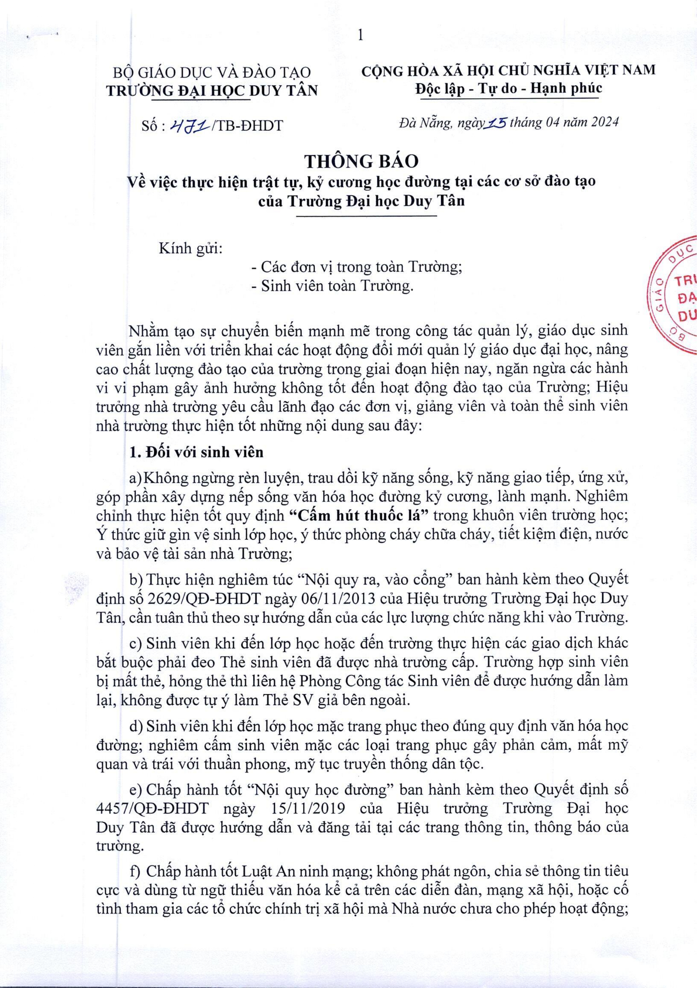 Thông báo V/v thực hiện trật tự, kỷ cương học đường tại các cơ sở đào tạo của Trường Đại học Duy Tân