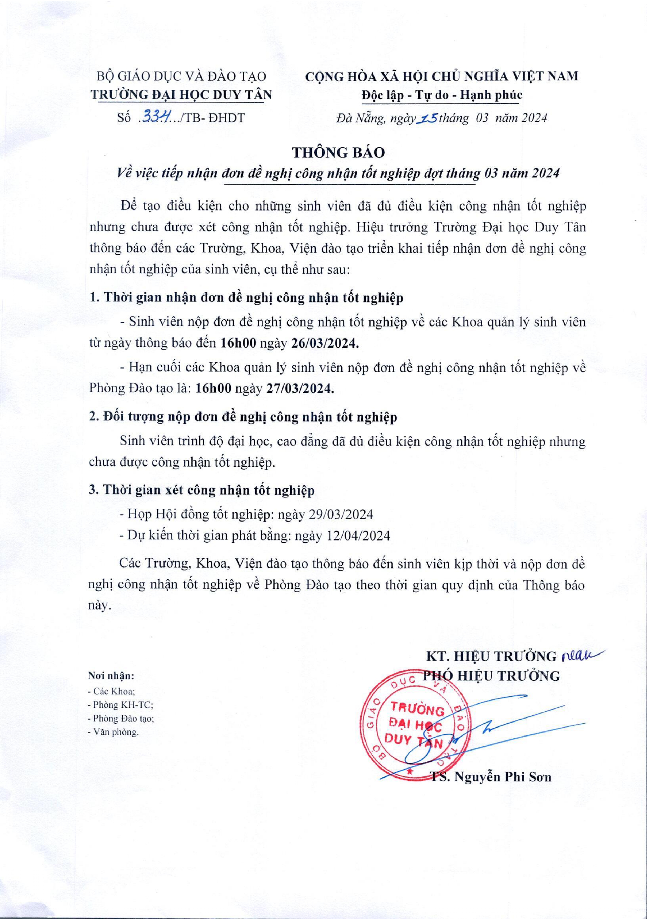 Thông báo V/v tiếp nhận đơn đề nghị công nhận tốt nghiệp đợt tháng 3/2024