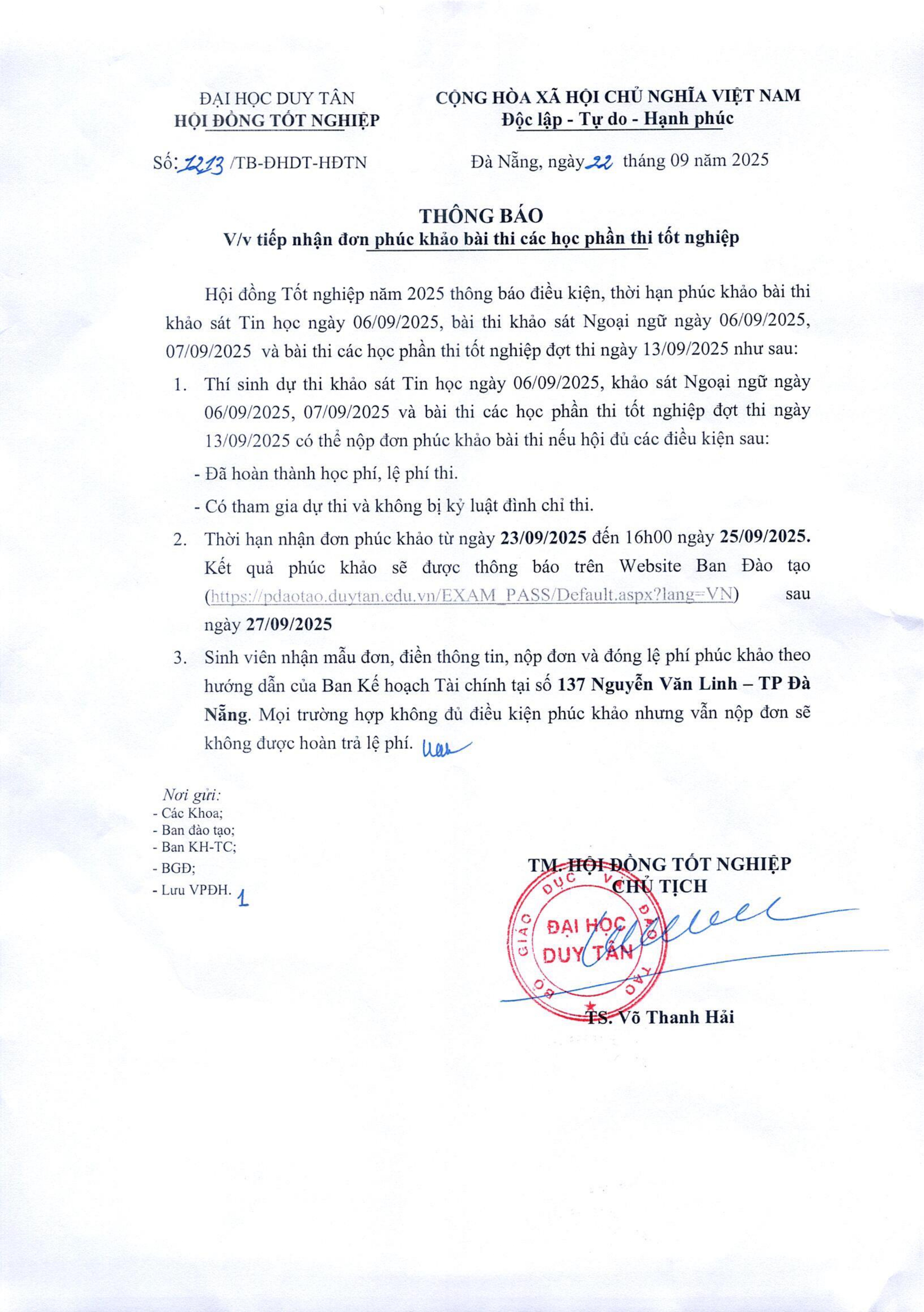 Thông báo v/v tiếp nhận đơn phúc khảo bài thi khảo sát và thi tốt nghiệp T9/2025