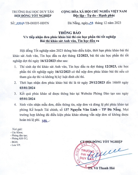 - Thông báo kết quả phúc khảo tháng 12/2025