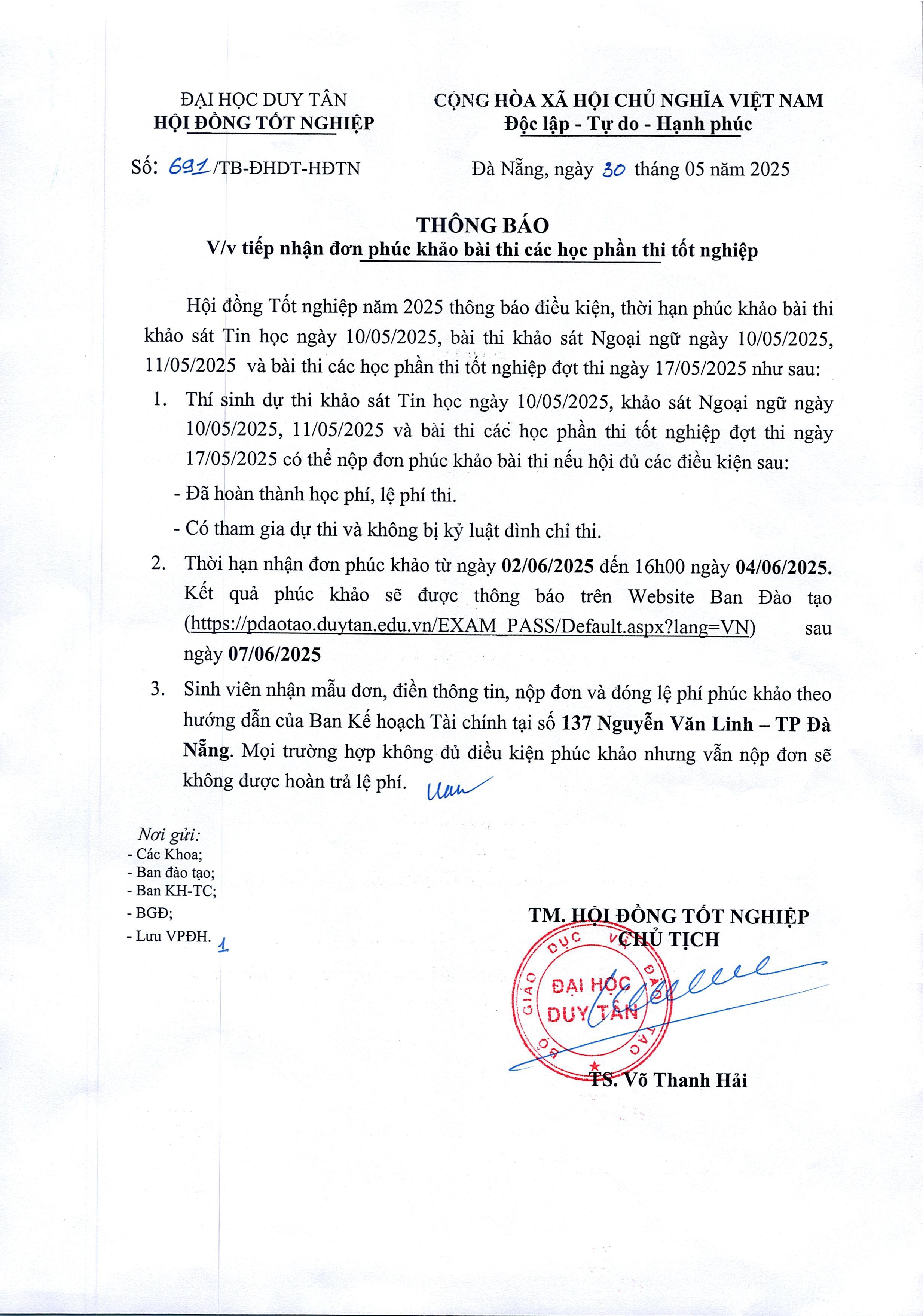Thông báo V/v tiếp nhận đơn phúc khảo bài thi các học phần thi tốt nghiệp