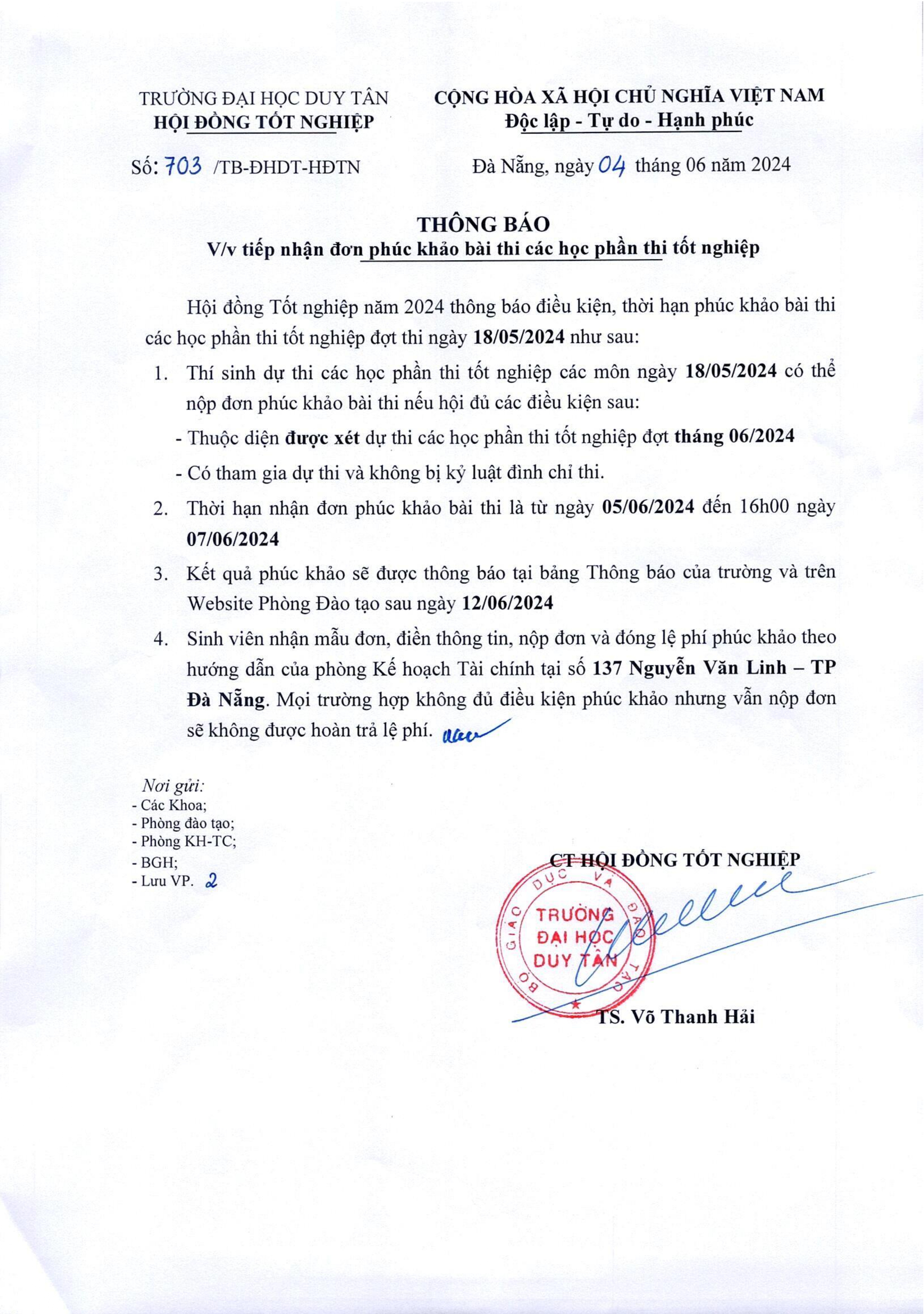 Thông báo V/v Tiếp nhận đơn phúc khảo bài thi các học phần thi tốt nghiệp