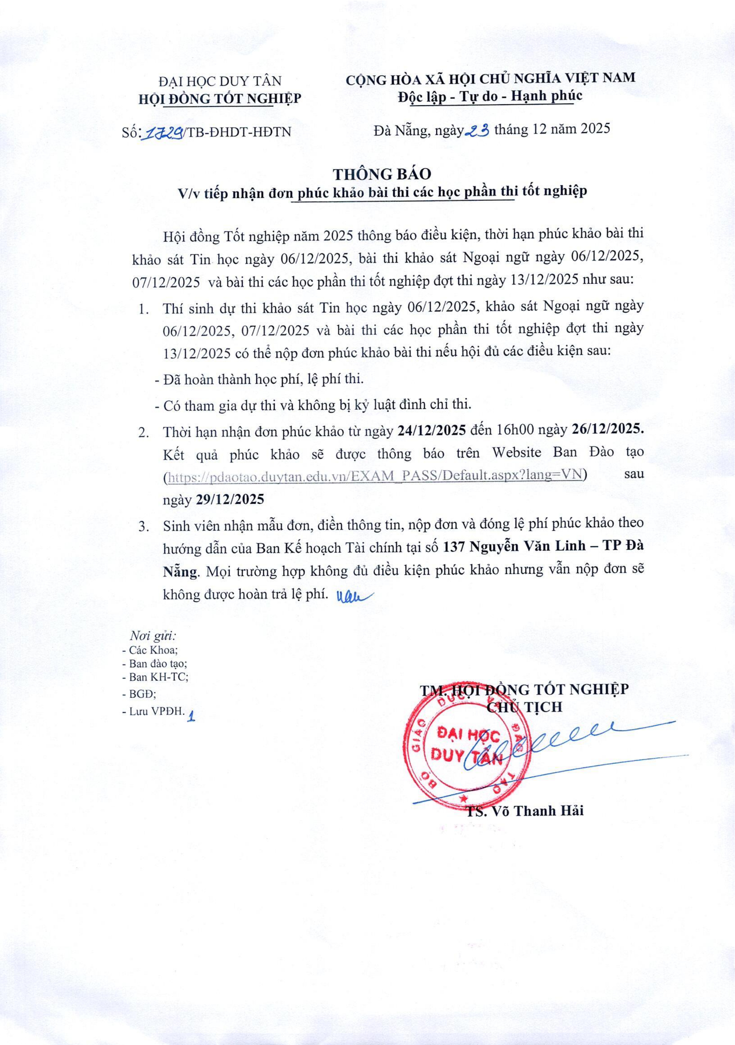 - Thông báo kết quả phúc khảo tháng 12/2025
