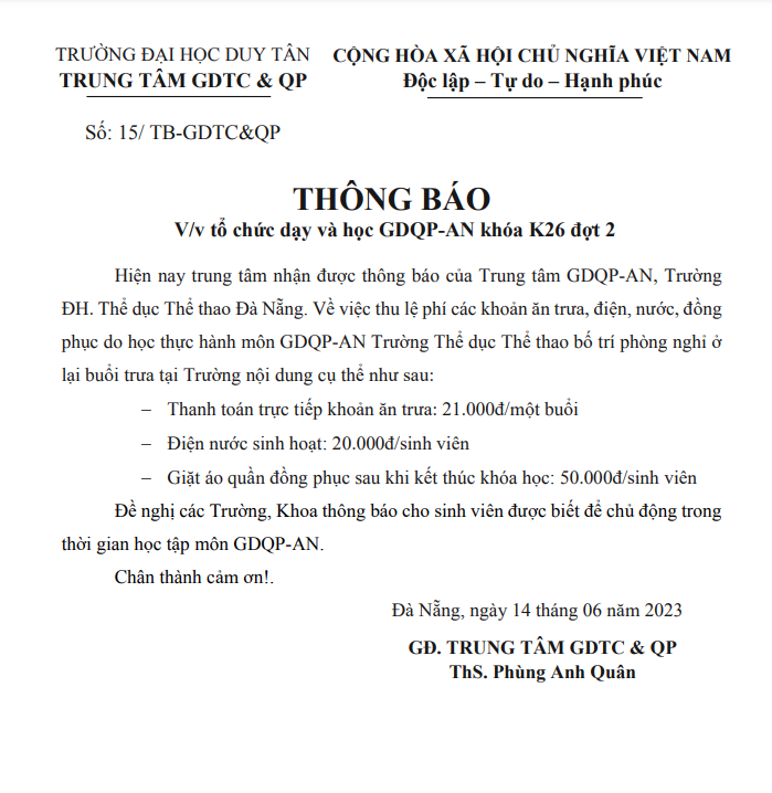 Thông báo V/v tổ chức dạy và học GDQP-AN khóa K26 đợt 2