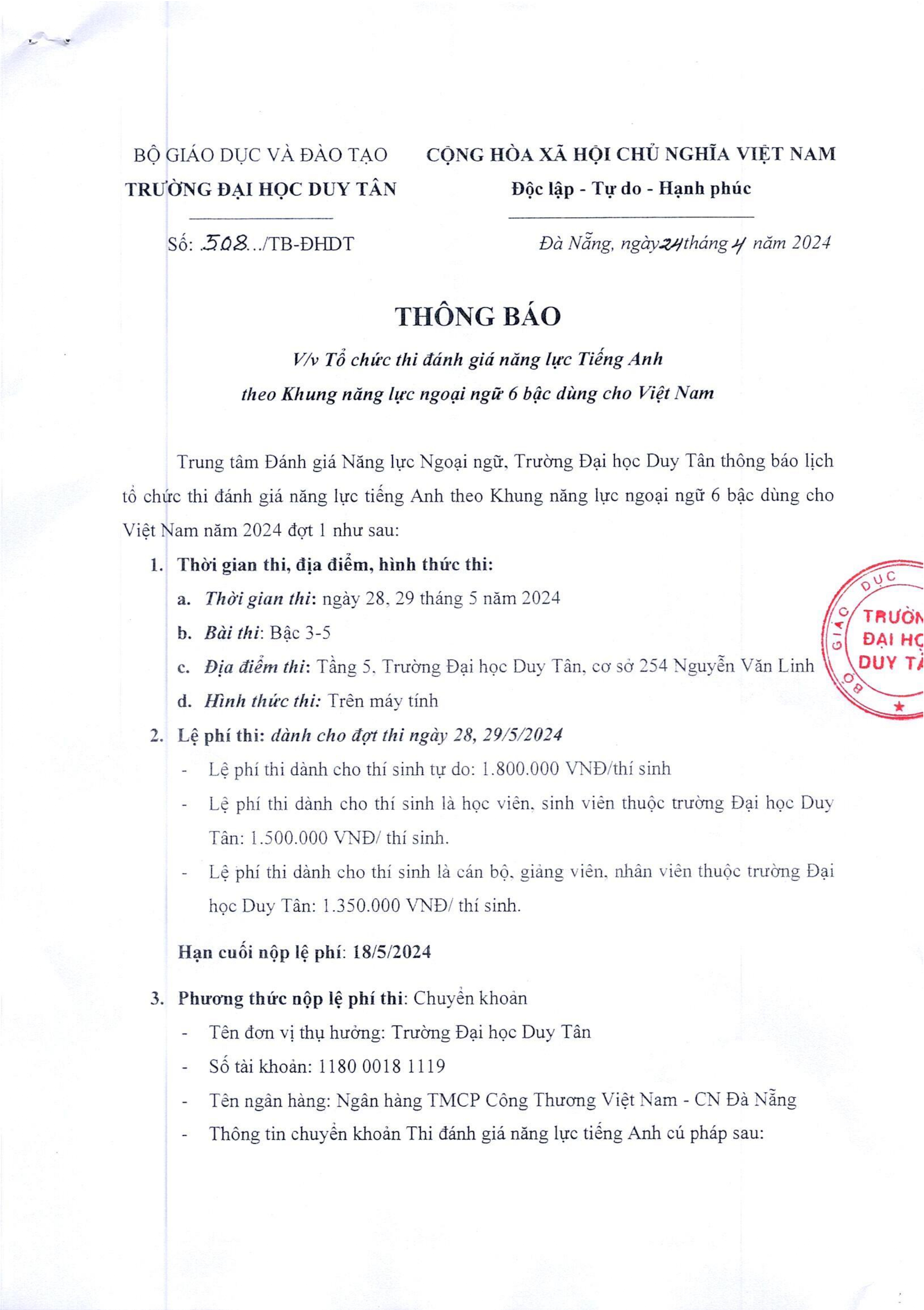 Thông báo V/v Tổ chức thi đánh giá năng lực Tiếng Anh theo Khung năng lực ngoại ngữ 6 bậc dùng cho Việt Nam