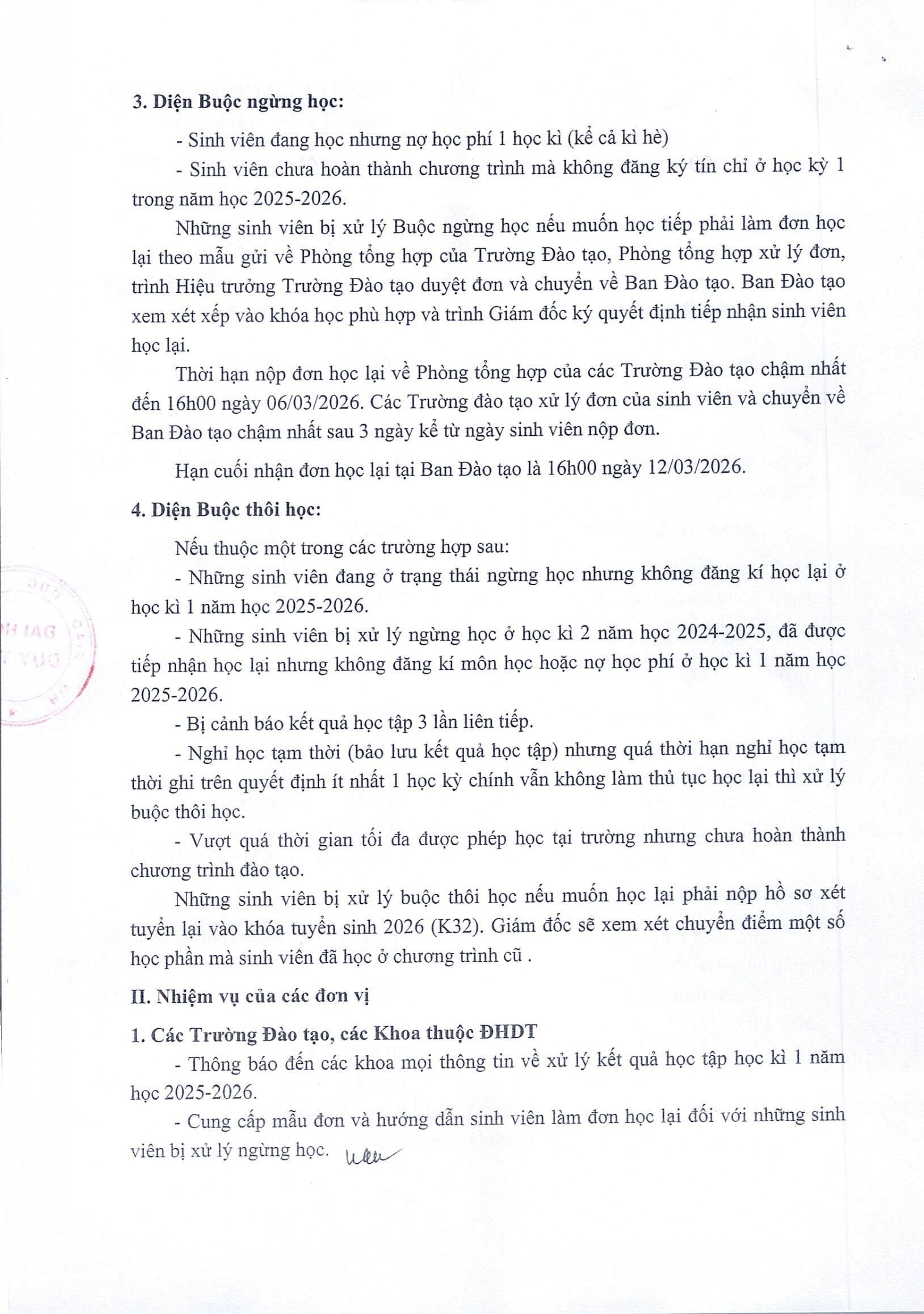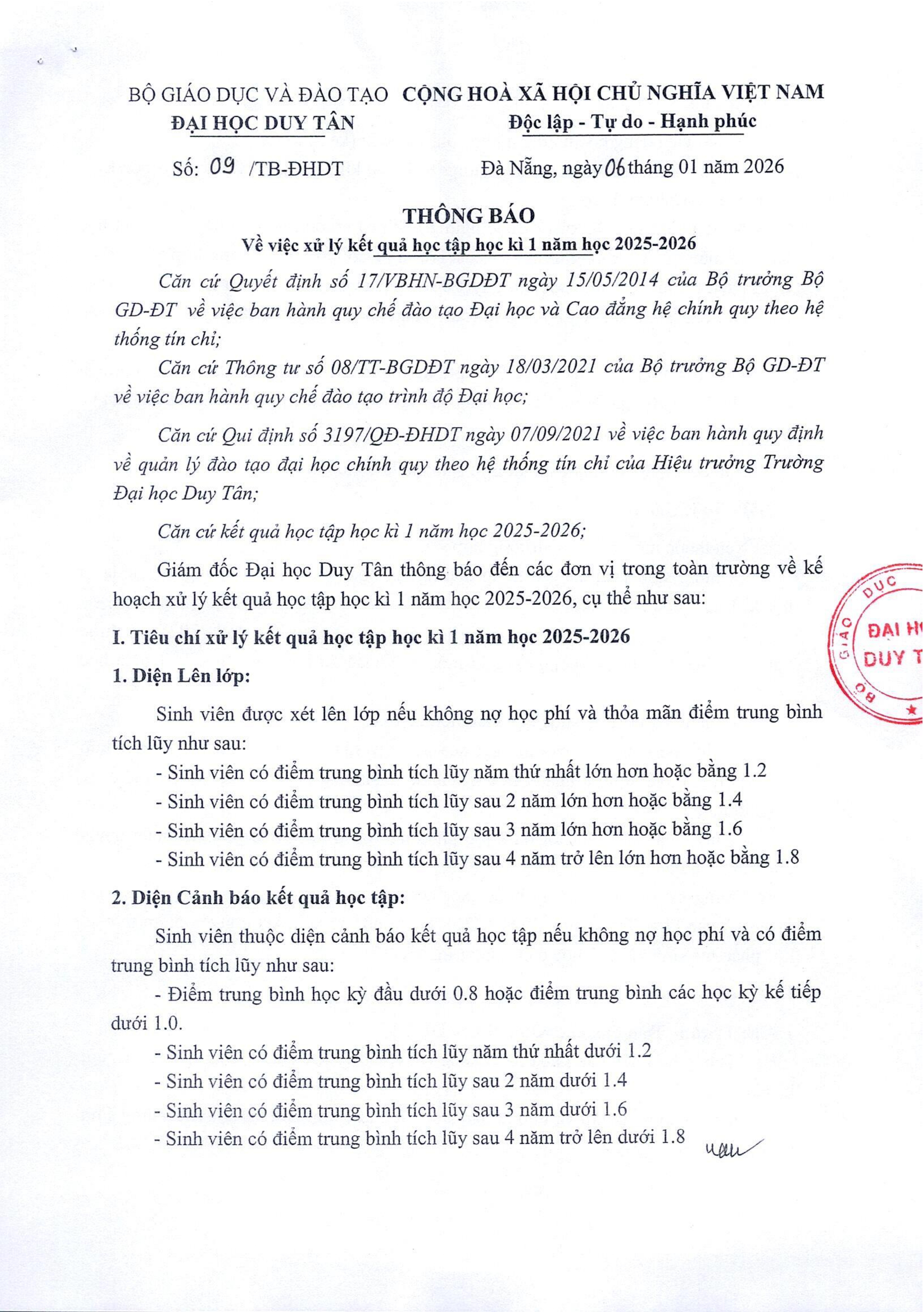 Thông báo V/v Xử lý kết quả học tập học kì 1 năm học 2025-2026