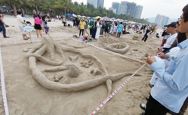 Dịp lễ 30.4 và 1.5, trên bãi biển của Đà Nẵng, nhiều du khách, người dân đội nắng tham dự cuộc thi đắp tượng cát nghệ thuật.