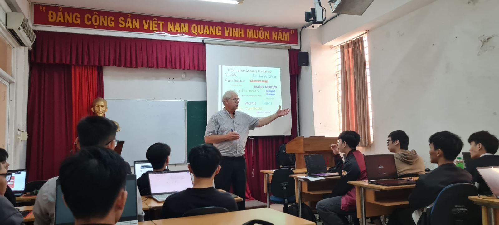 Prof. Gerhard Steinke (từ SPU Hoa Kỳ) đang giảng dạy môn Security Architecture cho SV năm cuối ngành An ninh mạng