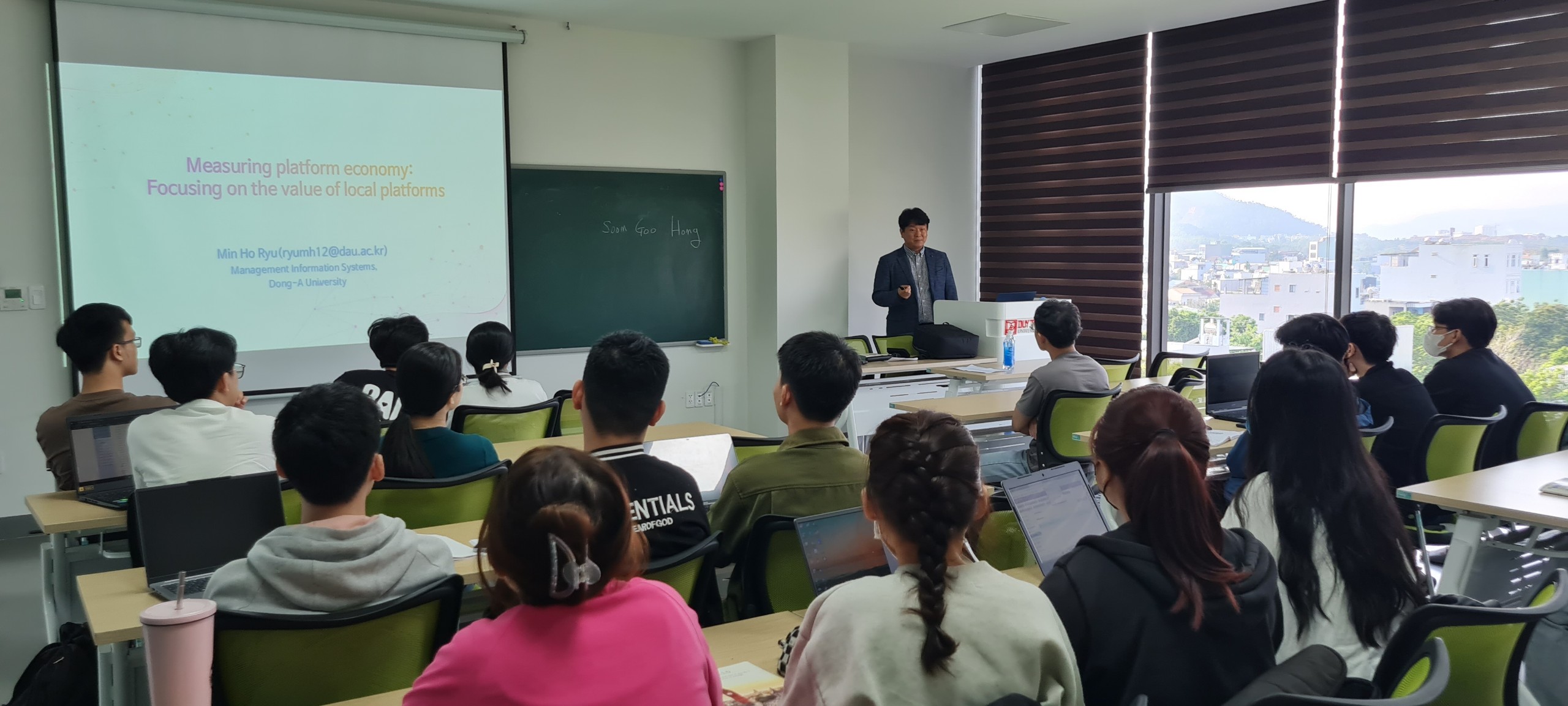 Trong bài viết là những hình ảnh trong buổi học đầu tiên, được đứng lớp bởi PGS TS.Ryu Min Ho, Trưởng khoa Hệ thống thông tin kiêm Giám đốc chương trình BK21 của Đại học DongA, Hàn Quốc; Và TS.Hong Soo Goo, Giám đốc trung tâm nghiên cứu, Giảng viên Trường ĐTQT.