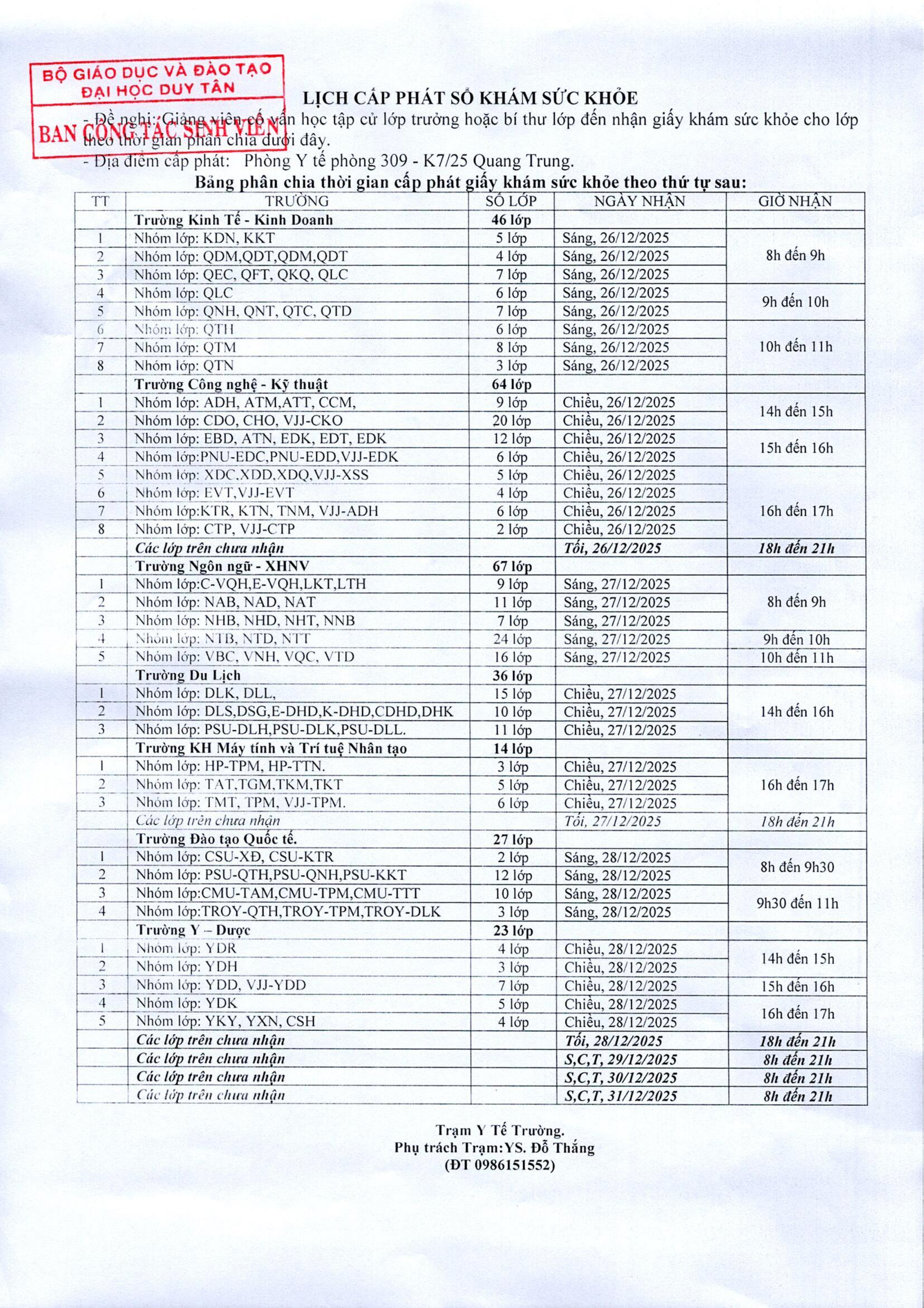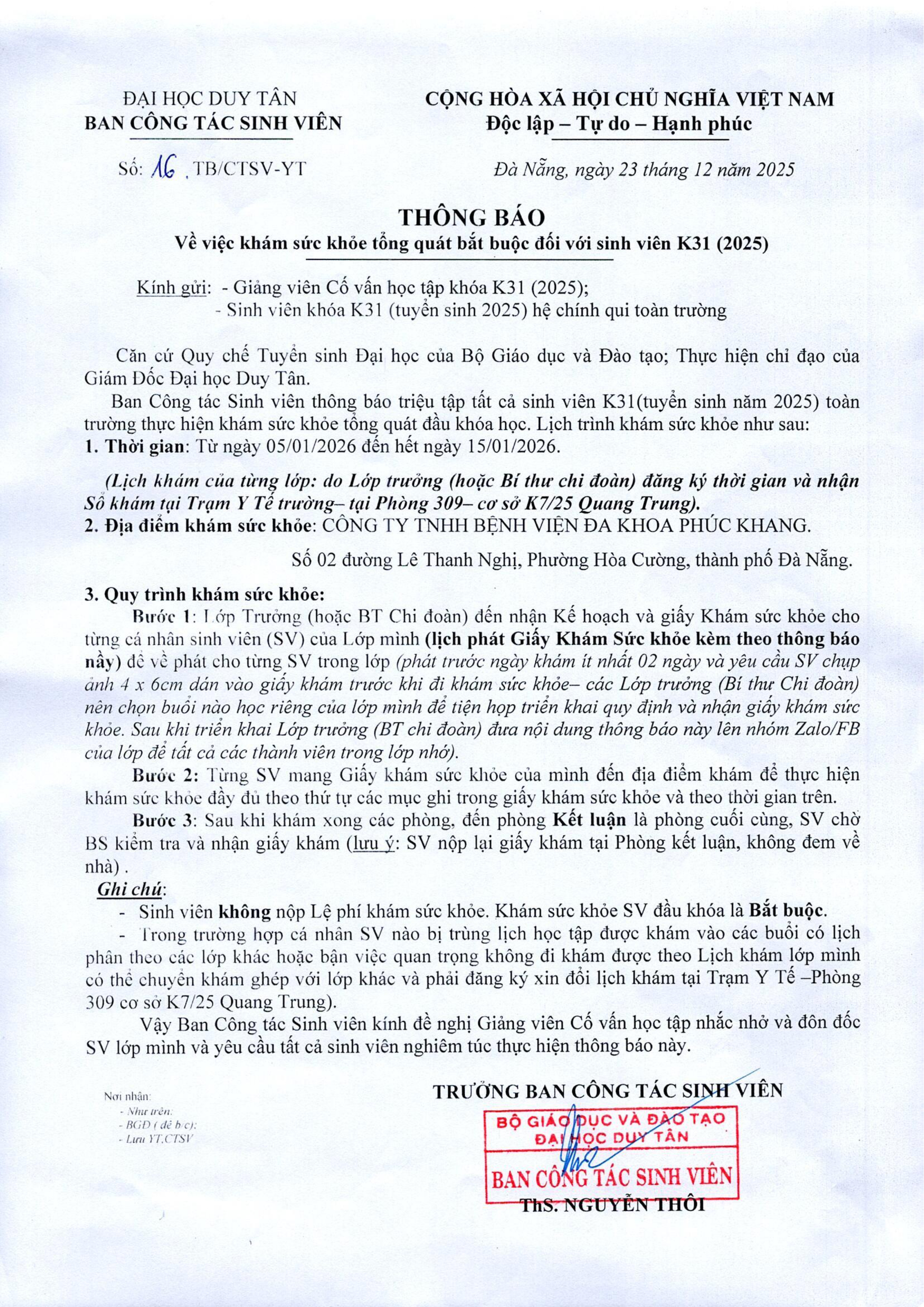Thông báo V/v Khám sức khỏe tổng quát bắt buộc đối với sinh viên K31 (2025)