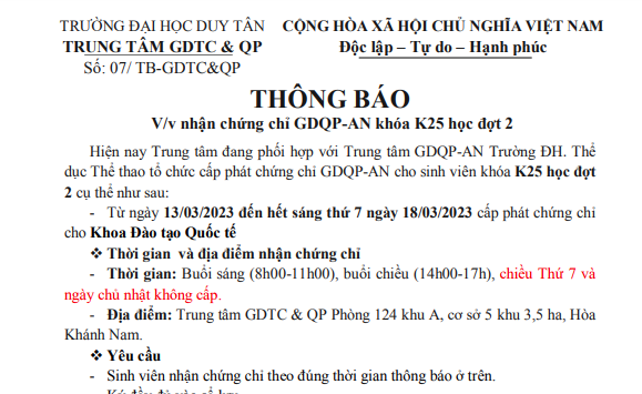 Trung tâm GDTC & QP thông báo về việc nhận chứng chỉ GDQP-AN khóa K25 học đợt 2, các em xem danh sách trong file đính kèm nhé.