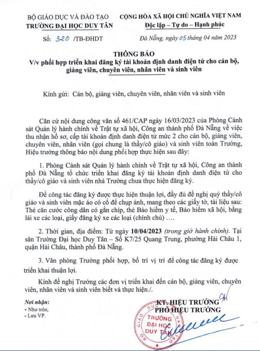 Thông báo V/v phối hợp triển khai đăng ký tài khoản định danh điện tử cho cán bộ, giảng viên, nhân viên và sinh viên