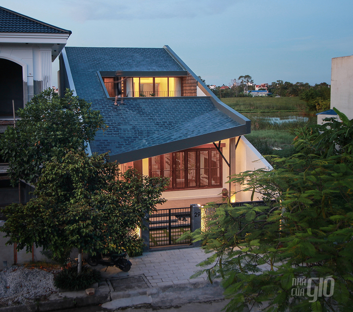Một góc mái xòa thấp để che nắng Tây, góc còn lại “vén” lên để đón hướng gió mát thổi vào nhà
