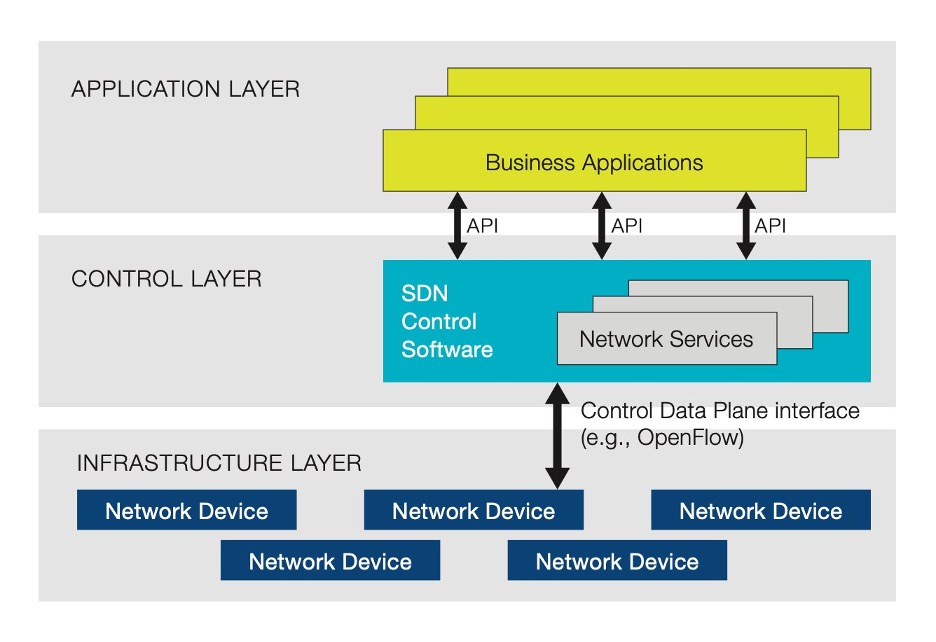 - Application Layer (Lớp ứng dụng): Đây là lớp mà người dùng hoặc các ứng dụng mạng tương tác với. Các ứng dụng này có thể yêu cầu lớp điều khiển thực hiện các hành động cụ thể, như thay đổi cấu hình mạng, giám sát lưu lượng hoặc bảo mật.