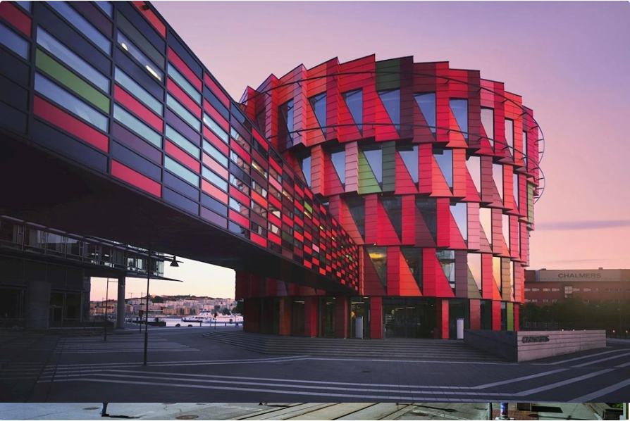 Tòa nhà Kuggen (Đại học Gothenburg, Thuỵ Điển): Tòa nhà hình trụ màu đỏ tại Đại học Gothenburg sử dụng công nghệ xây dựng xanh mới nhất, là nơi đặt thư viện Chalmers và đào tạo chương trình thạc sĩ về thiết kế game của trường. Theo tiếng Thụy Điển, “kuggen” có nghĩa là “bánh răng cưa”, tượng trưng cho sự kết nối giữa lĩnh vực học thuật và các ngành truyền thông kỹ thuật số – vốn là những chuyên ngành được đào tạo và nghiên cứu trong tòa nhà. Ảnh: Pixels.