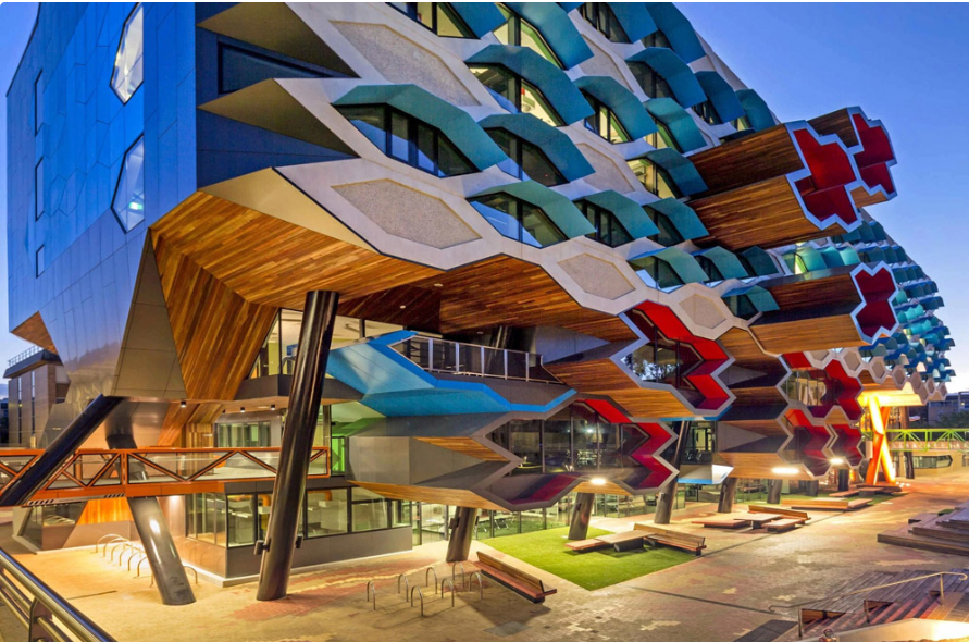 Viện Khoa học Phân tử La Trobe: Viện Khoa học Phân tử La Trobe thuộc Đại học La Trobe (Australia), được khánh thành vào năm 2013. Thiết kế tòa nhà lấy cảm hứng từ chính những cấu trúc phân tử – lĩnh vực nghiên cứu chủ đạo diễn ra bên trong. Các cửa sổ của tòa nhà được thiết kế mô phỏng hình ảnh các nguyên tử liên kết hóa học. Các cột trụ viện lại có hình dạng chữ X và Y, tượng trưng cho nhiễm sắc thể. Ảnh: La Trobe University.