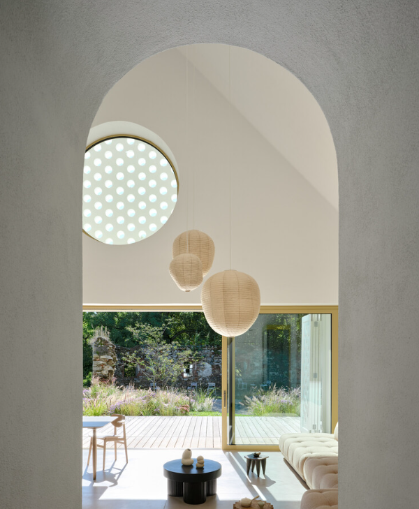 Vật liệu được lựa chọn kỹ lưỡng nhằm giữ gìn bản sắc địa phương: kết cấu tường gạch ceramic cách nhiệt, mái lợp ngói nung, hệ lam gỗ thông và vân sam sơn trắng. Bên trong, ánh sáng tự nhiên len lỏi qua các khe hở, hắt lên những bề mặt thô mộc, tạo nên hiệu ứng chuyển động nhẹ nhàng suốt ngày dài. Phòng ngủ và phòng khách chính hướng thẳng ra vườn cây ăn trái, nơi có thể ngắm bình minh và trăng lên; trong khi bức tường gạch đục lỗ và cửa sổ tròn lớn ở mặt Nam kết nối trực tiếp với sân trong và tàn tích nhà kho cũ. Về đêm, ánh sáng từ những hốc tường phát sáng khiến ngôi nhà tựa như một chiếc đèn lồng tỏa rạng giữa thiên nhiên.
