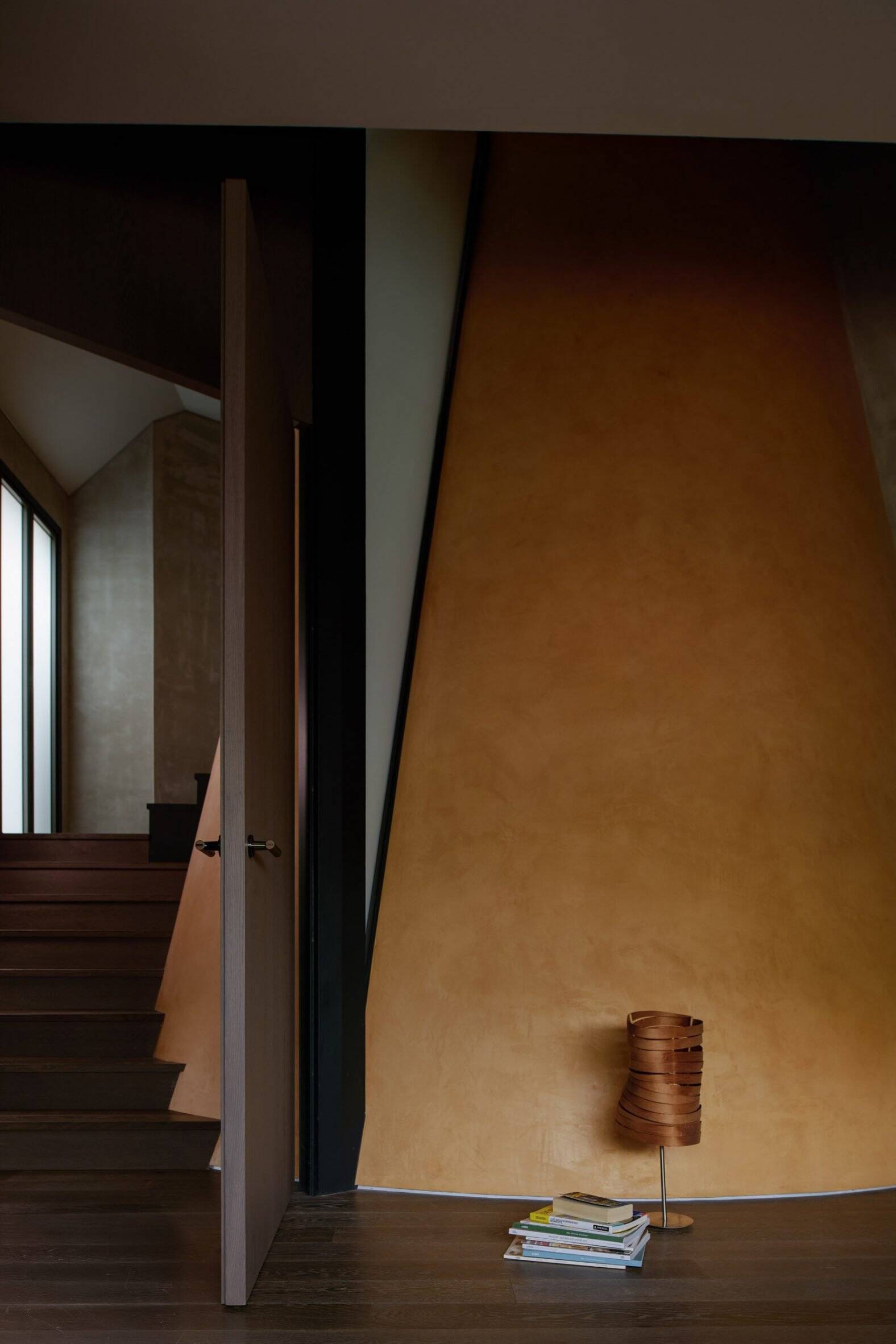 At the heart of the house, an oval-shaped sculptural void is suspended above the dining area. This striking design recalls the neo-classical house from the 1990s that once stood on the site, while also functioning as a passive cooling system—channeling hot air upward and expelling it through concealed exhaust fans. Daylight from the skylight filters through the opening, casting dynamic shadows that move across the floors throughout the day.