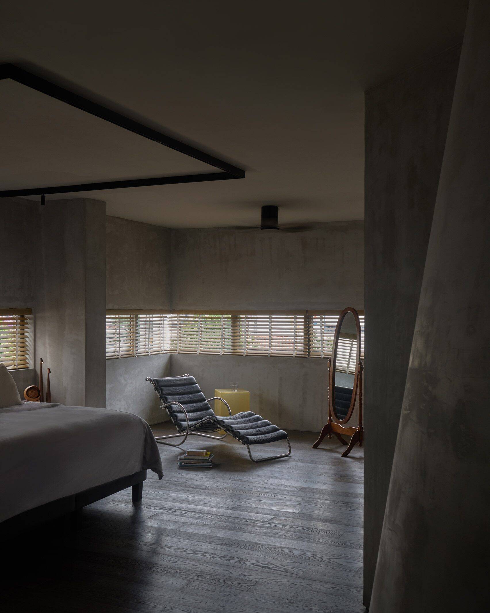 The main living and dining areas of QR3D are located on the ground floor, while the upper floors are dedicated to bedrooms and private workspaces. On these upper levels, long and narrow windows carved into the façade ensure privacy for the homeowners while helping the building remain cool in Singapore’s hot and humid climate.