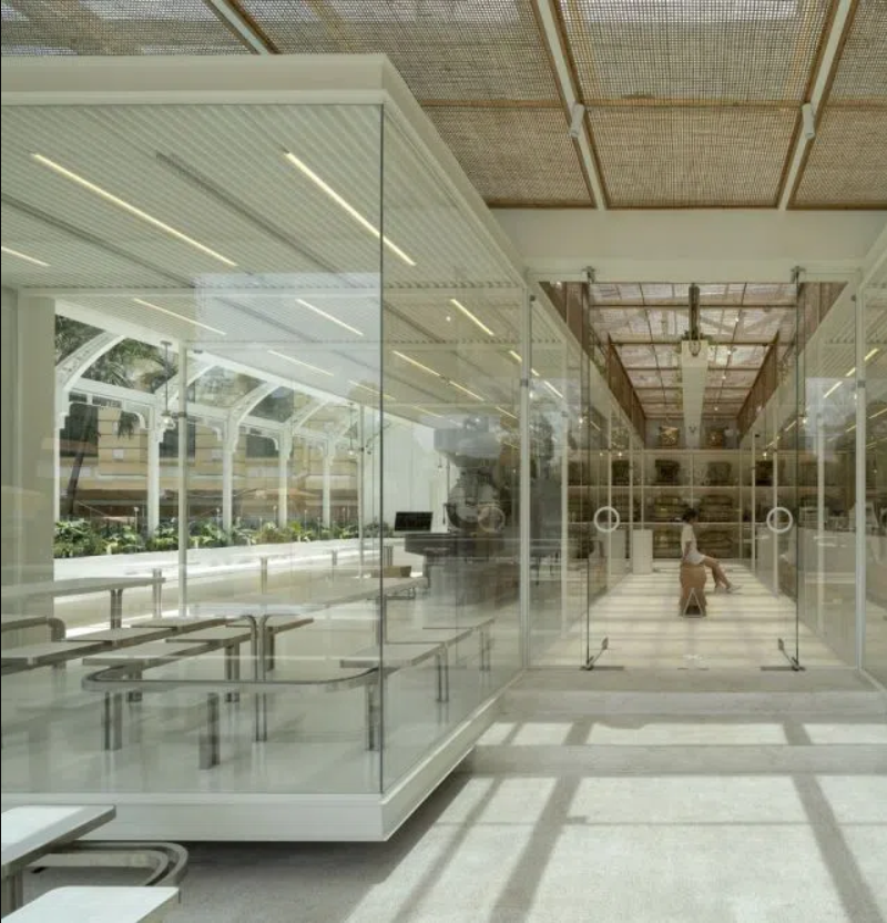 Một lối đi trung tâm, tràn ngập ánh sáng tự nhiên hắt qua trần nhà bằng mây, mời gọi du khách khám phá bên trong hoặc thư giãn trên ghế dài trong khi thưởng thức cà phê. Sự đan xen giữa ánh sáng và bóng tối, cùng với kết cấu tinh tế của vật liệu, tạo ra cảm giác yên bình và ấm áp.