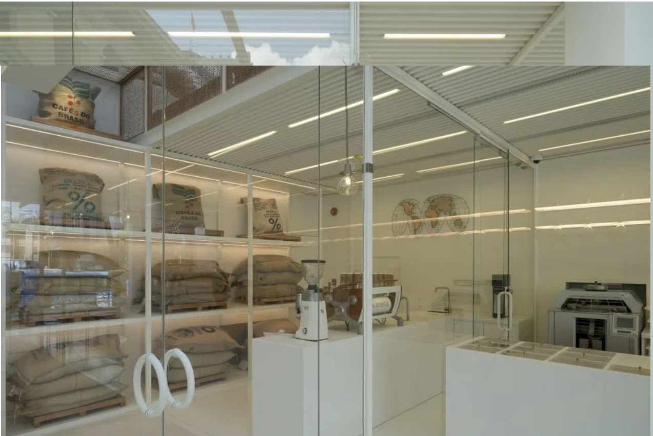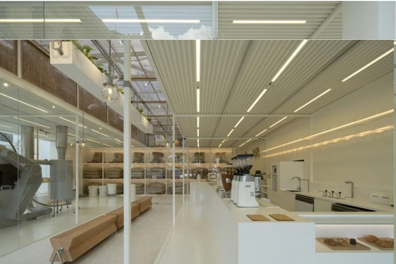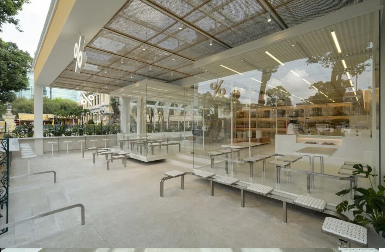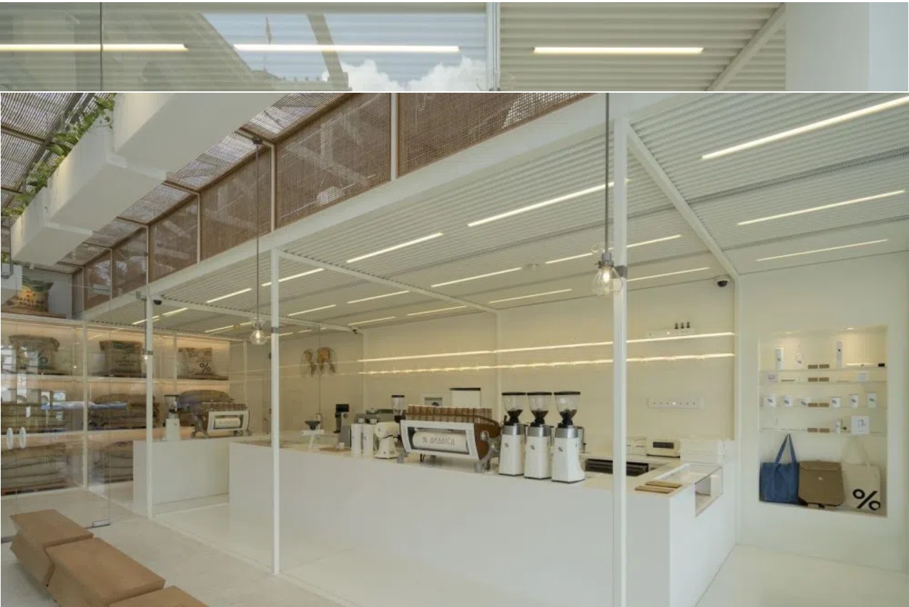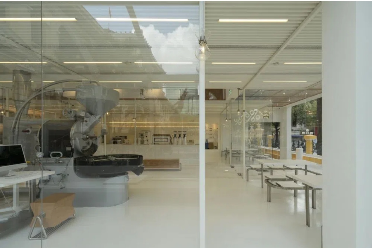 Tổng thể, % Arabica Roastery mang phong cách công nghiệp với gam màu trắng chủ đạo